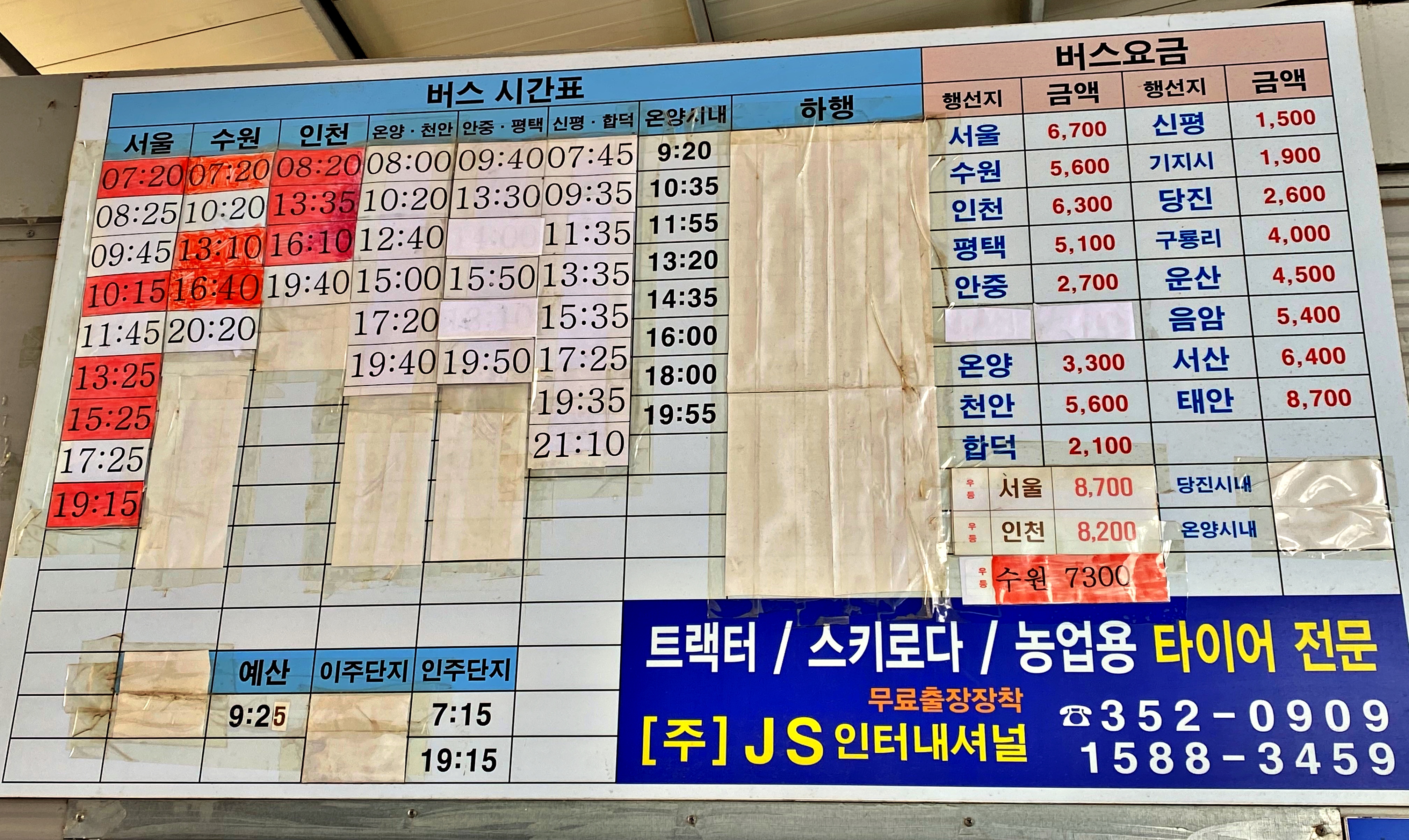 서울,수원,인천의 빨간 표시는 시외우등차량입니다. 서울행(남부터미널)은 일 9회, 수원행은 일 5회, 인천행은 일 4회 운행합니다. 당진을 경유하여 넘어오는 온양(아산),천안행은 일 6회 경유하고, 밀두리와 안중을 거쳐 평택터미널로 가는 평택행은 일 4회 운행합니다.