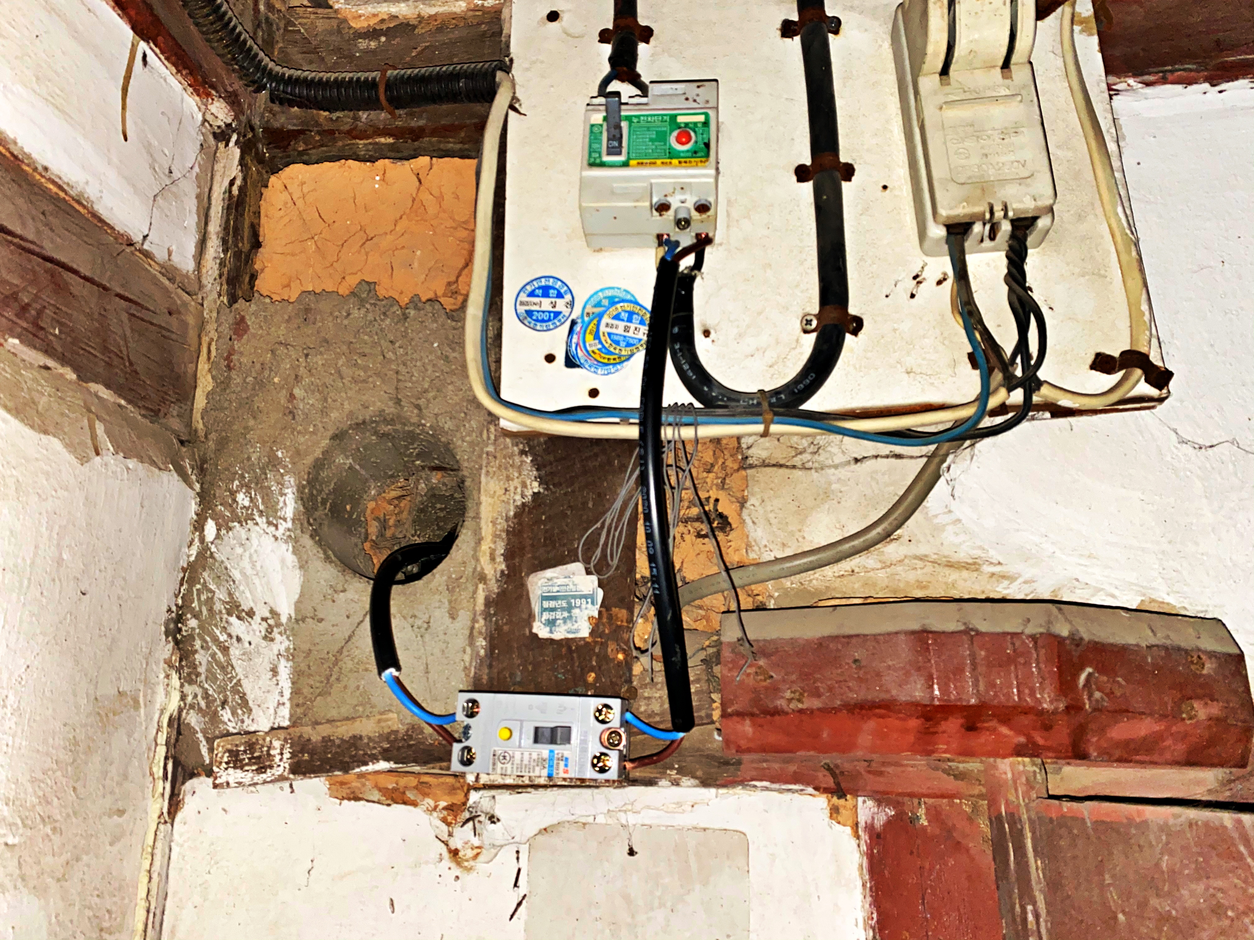 누전차단기도 잘 박아주고 차고로 가는 배선은 벽에 뚫려있던 구멍으로 빼줍니다.