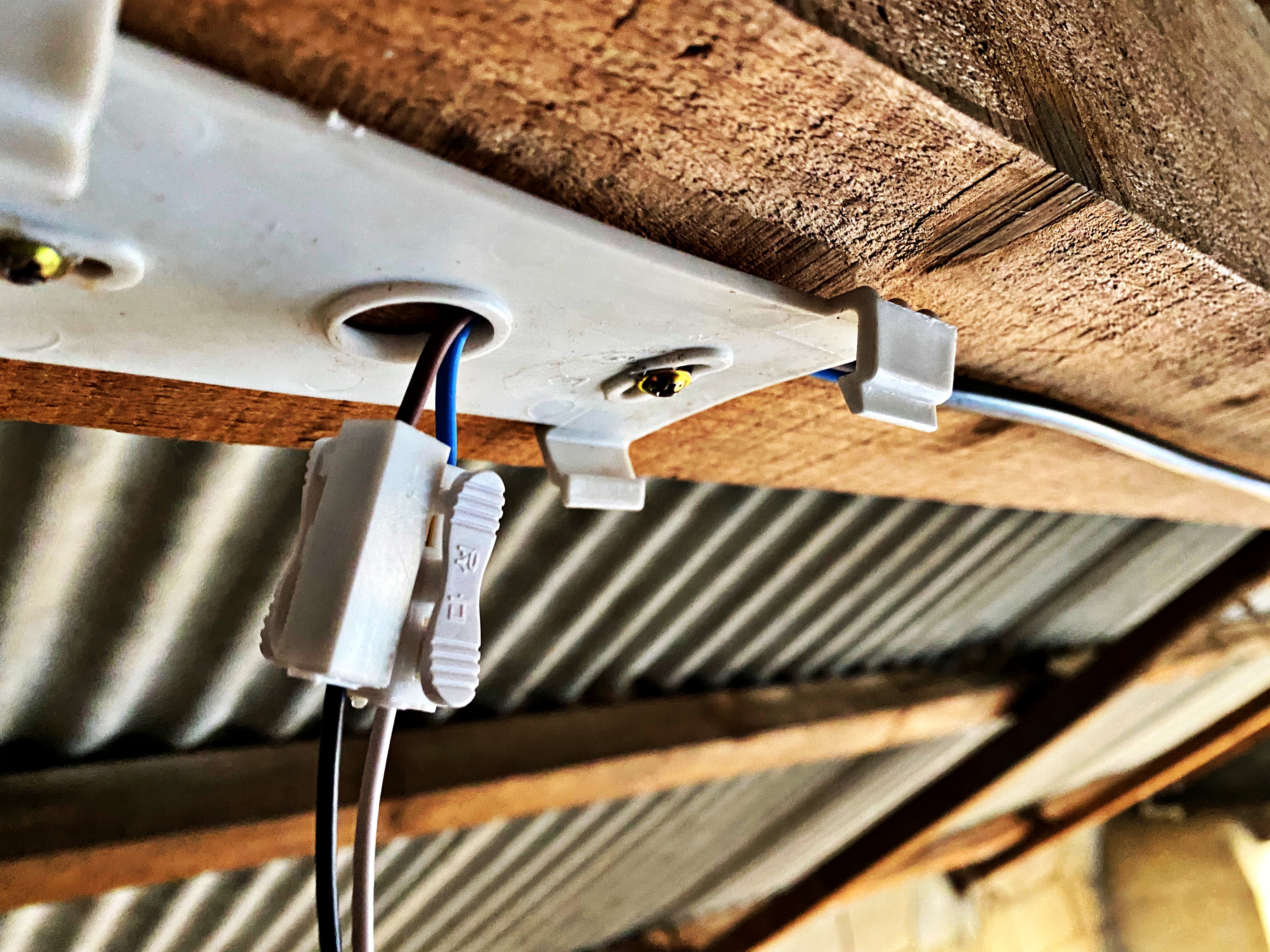 제조된지 보름만에 장착되는 LED 등기구네요. 장착에 앞서 배선을 어떻게 연결 할 것인지 미리 컨넥터와 배선의 피복을 벗겨 예행연습부터 하고 가기로 합니다. 전기를 따오는 일은 조금 어두워져도 상관 없으나 어두컴컴한 차고 안에서의 작업부터 빨리 마쳐야 하니 일단 형광등부터 달아주고 전기를 따오기로 합니다.