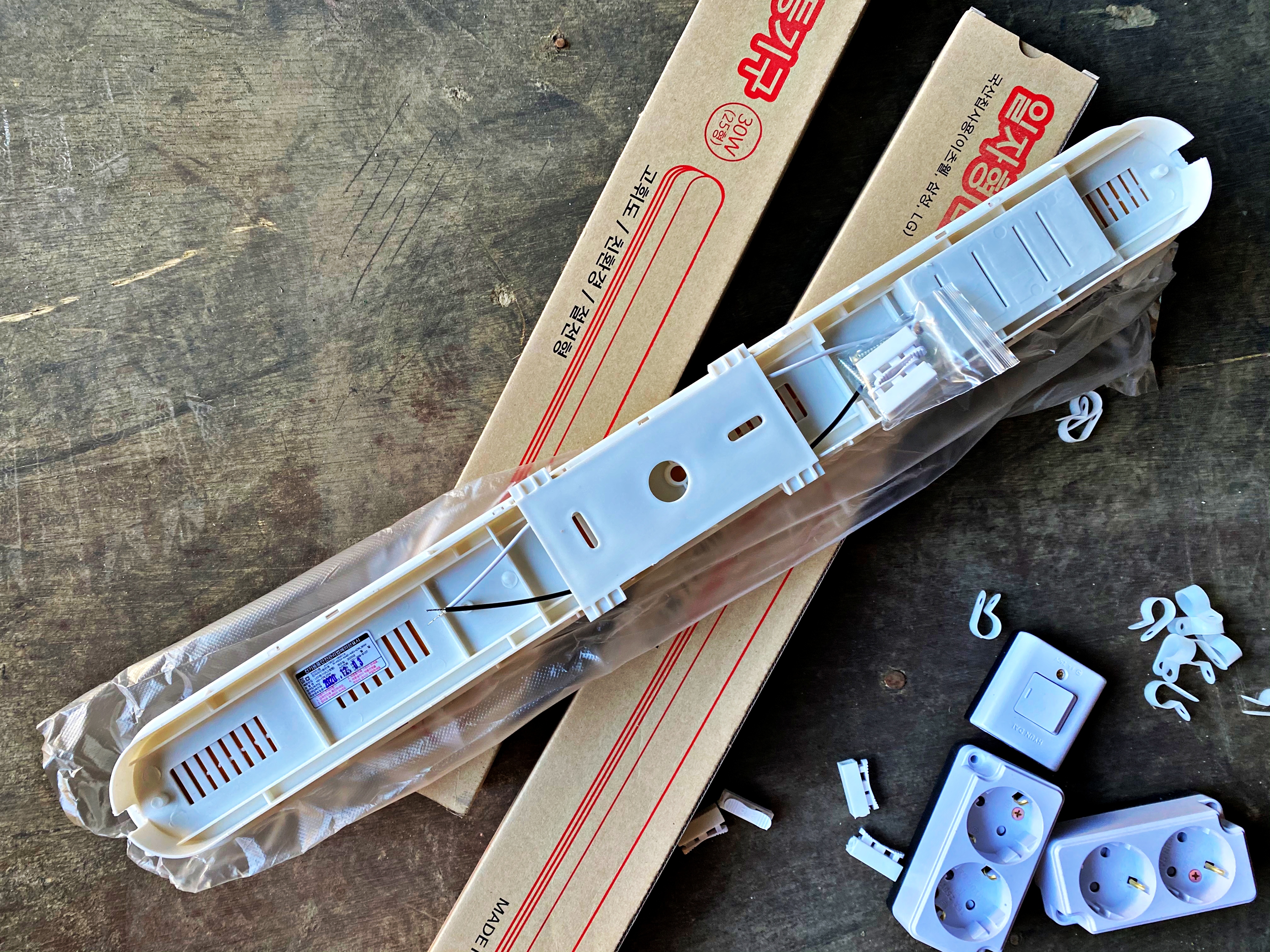 생각보다 얇은 배선과 2구 콘센트 2개. 그리고 일자형 LED 등기구라 적힌 일자등 2개가 보이고 주변으로 케이블클램프와 전등용 전원단자가 널려있습니다. 전원단자는 전등 박스 속에도 들어있더군요. 괜히 따로 구입한 느낌입니다만, 언젠가 쓸모는 있겠지 싶어 그냥 놔두기로 합니다.