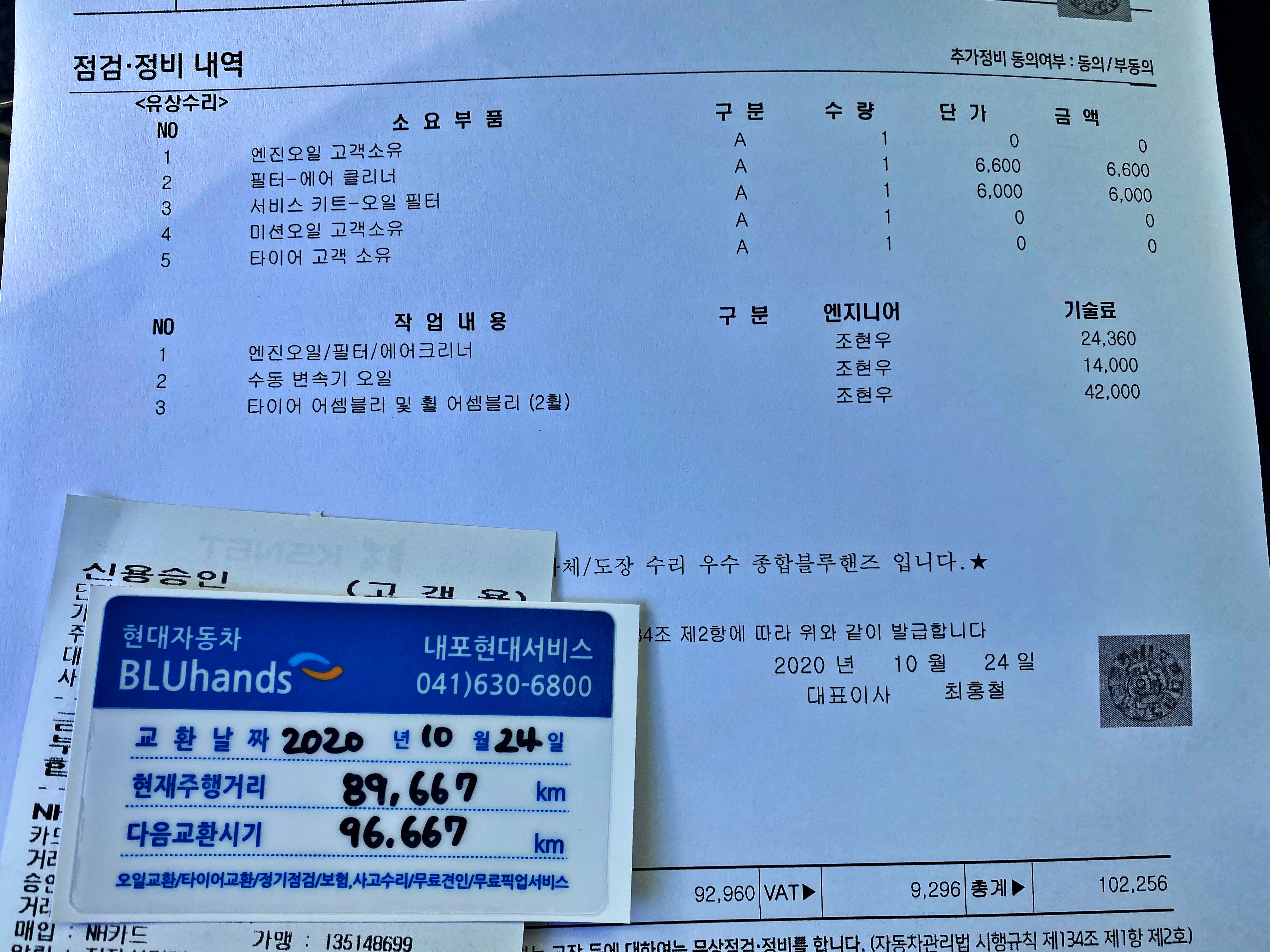 에어크리너와 오일필터만 구입했고 나머지는 다 가지고 왔습니다. 그럼에도 다 해서 10만 2천원을 결제했네요. 아마 올해가 가기 전 12월 중순 즈음에 엔진오일을 교체하는걸 제외한다면 올해는 크게 삼각떼 정비에 돈을 들일 일은 없을겁니다.