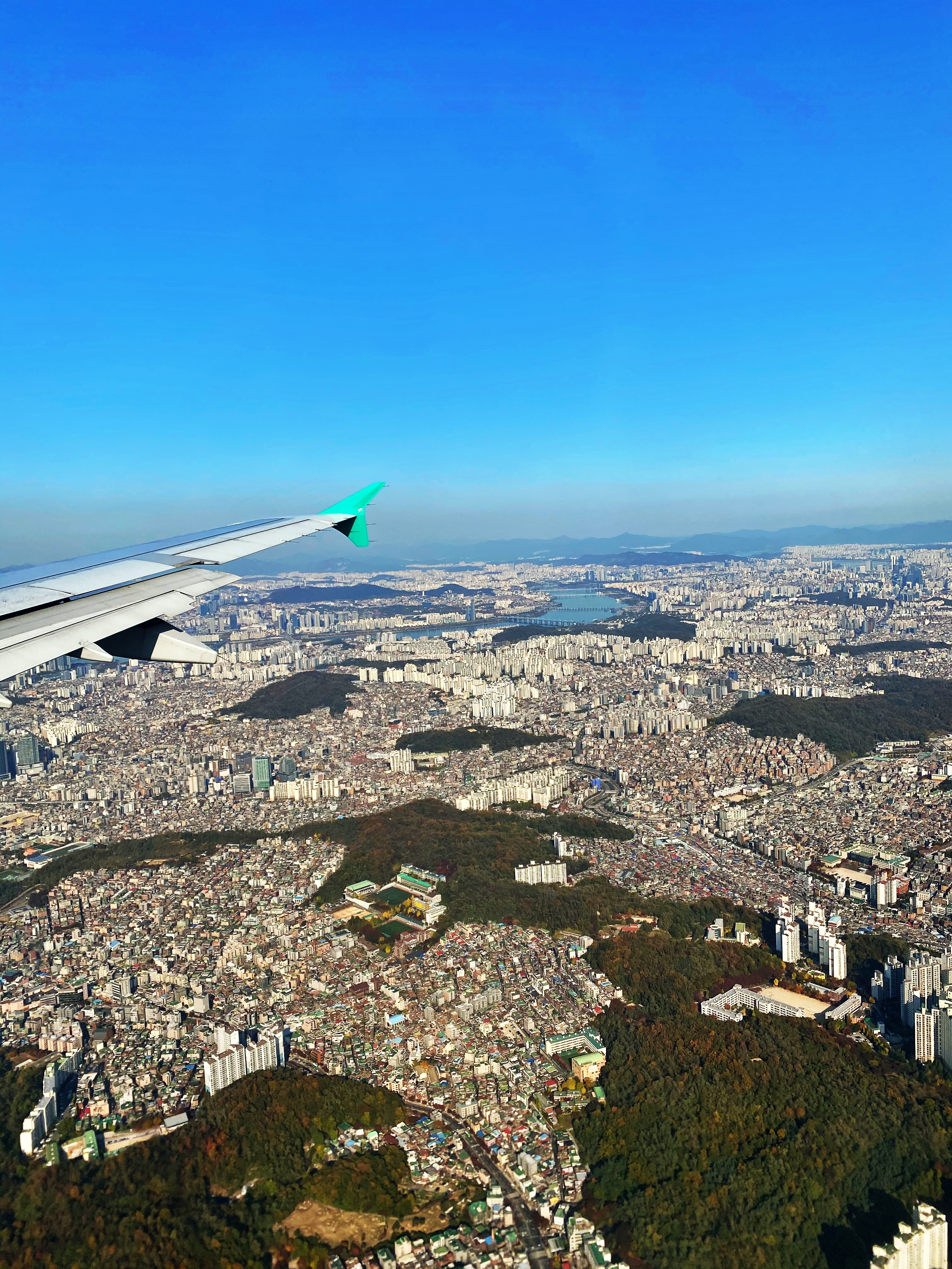 용인정도 오니 곧 우리 비행기는 착륙 할 예정이라는 안내방송이 나옵니다. 위 사진은 용인시 수지구 상공을 지나며 촬영한 사진입니다. 뭐 바로 아래 보이는 곳이 흔히 수지라 부르는 풍덕천동 일원이고, 우측 위로 보이는 곳이 죽전입니다. 쭉 뻗은 도로는 경부고속도로입니다. 차를 타고 가면 그래도 한참 가는 거리인데 사진 좌측으로 서울톨게이트가 보이고 분당신도시가 펼쳐져 있습니다.
