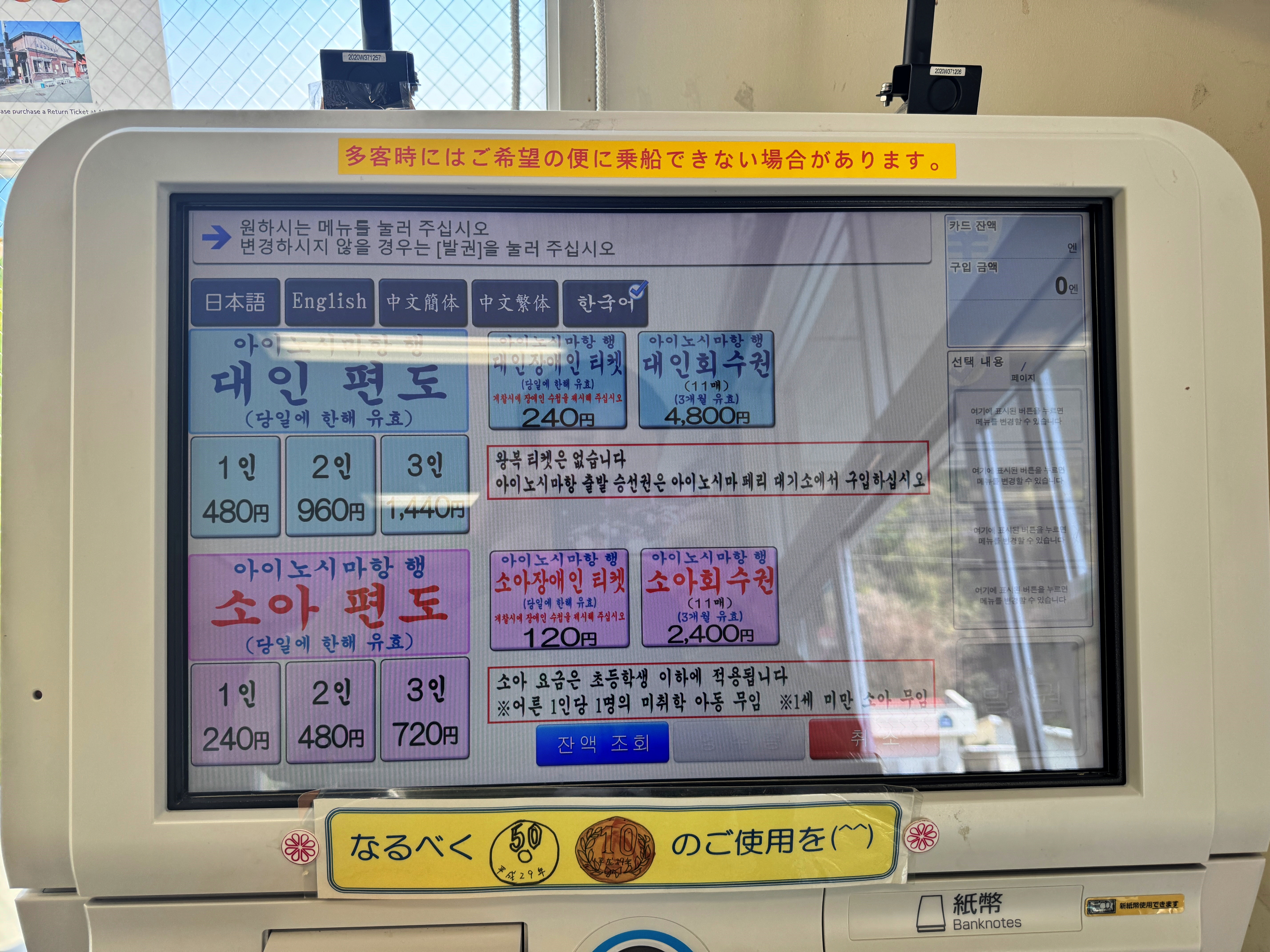 대인 편도 480엔. 소아 편도 240엔입니다.