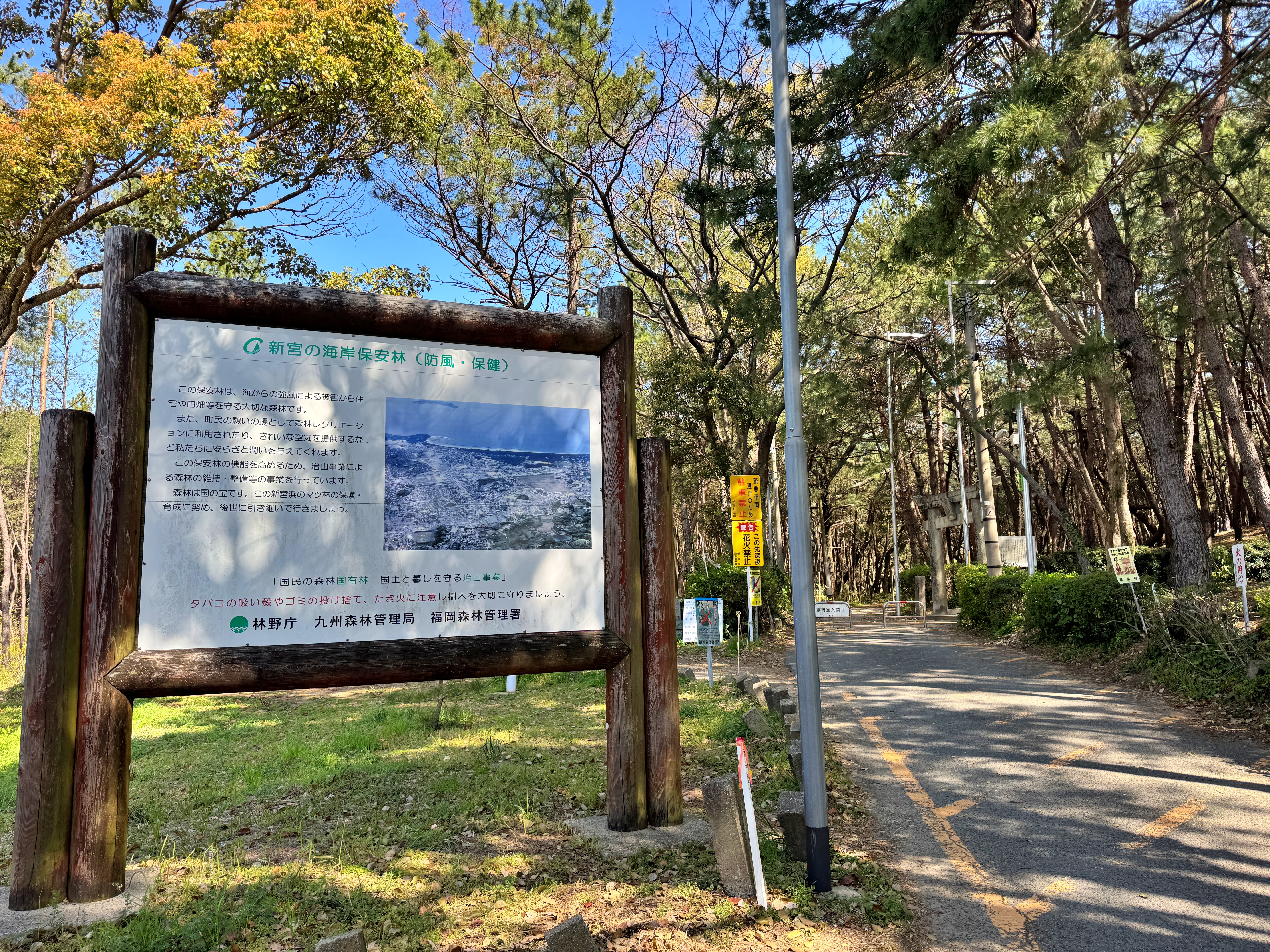 바로 옆으로 신사의 입구를 알리는 도리도 있네요. 일본에서 흔히 보이는 삼나무가 아닌 소나무가 식재된 숲이었습니다.