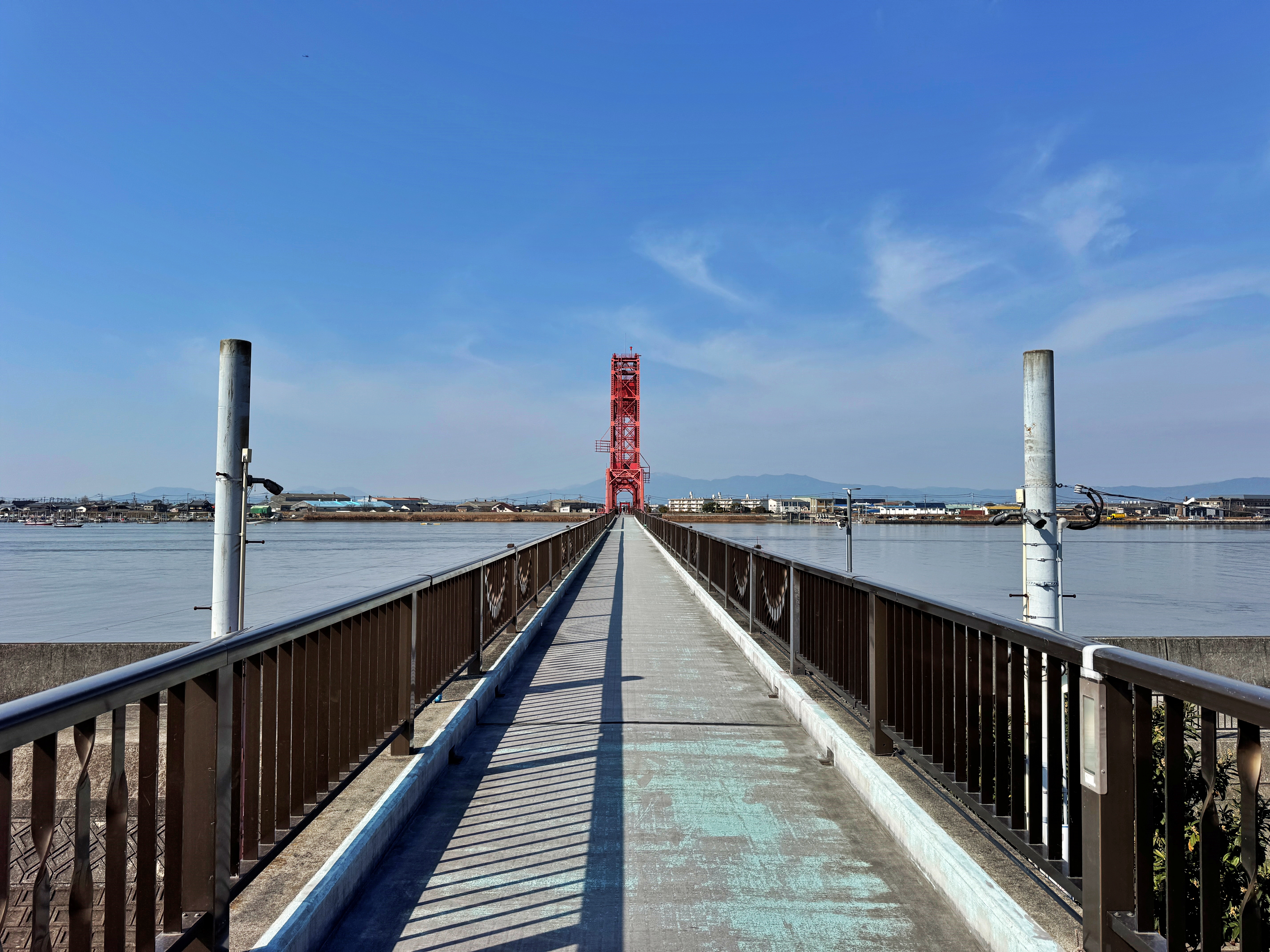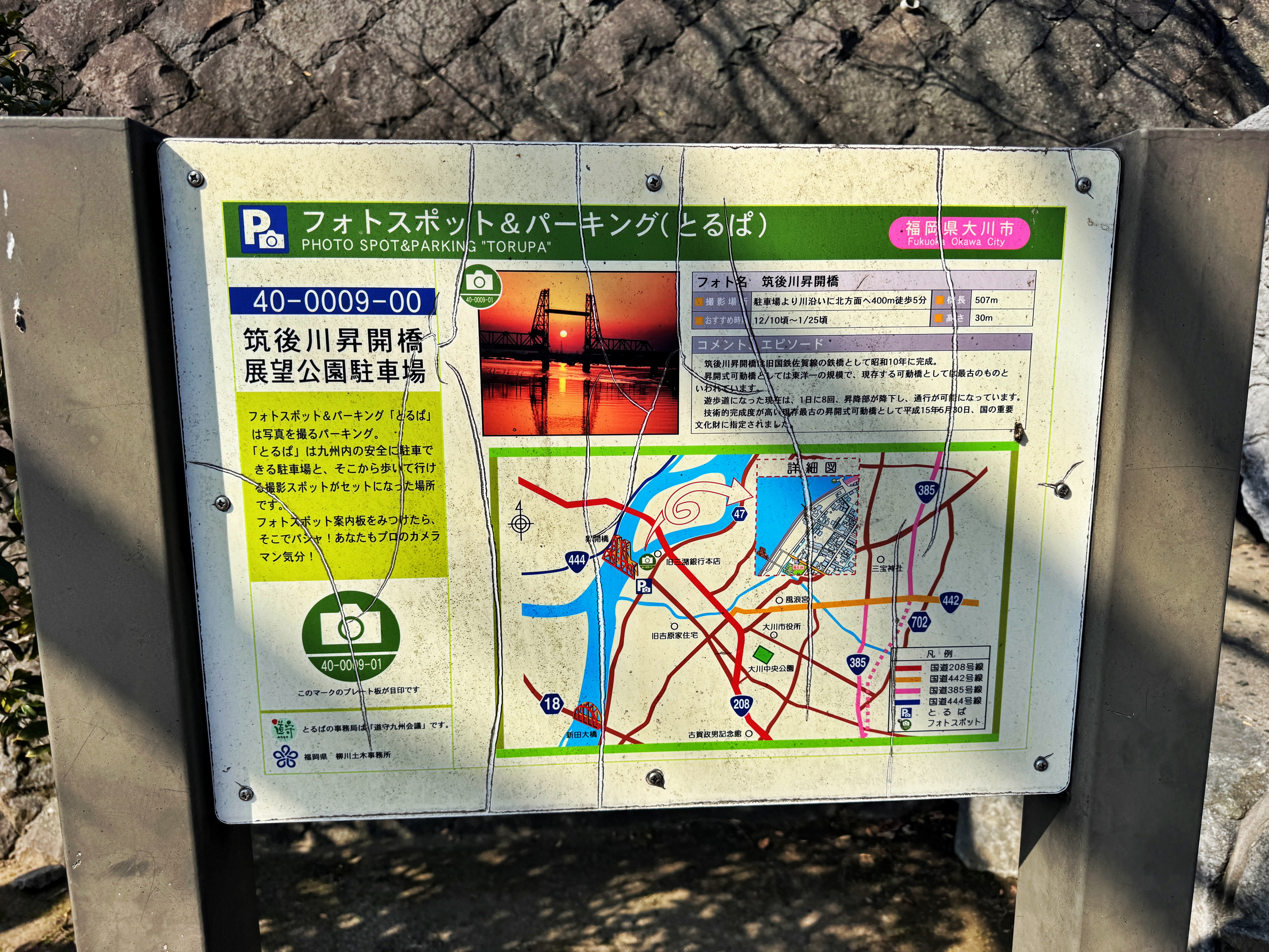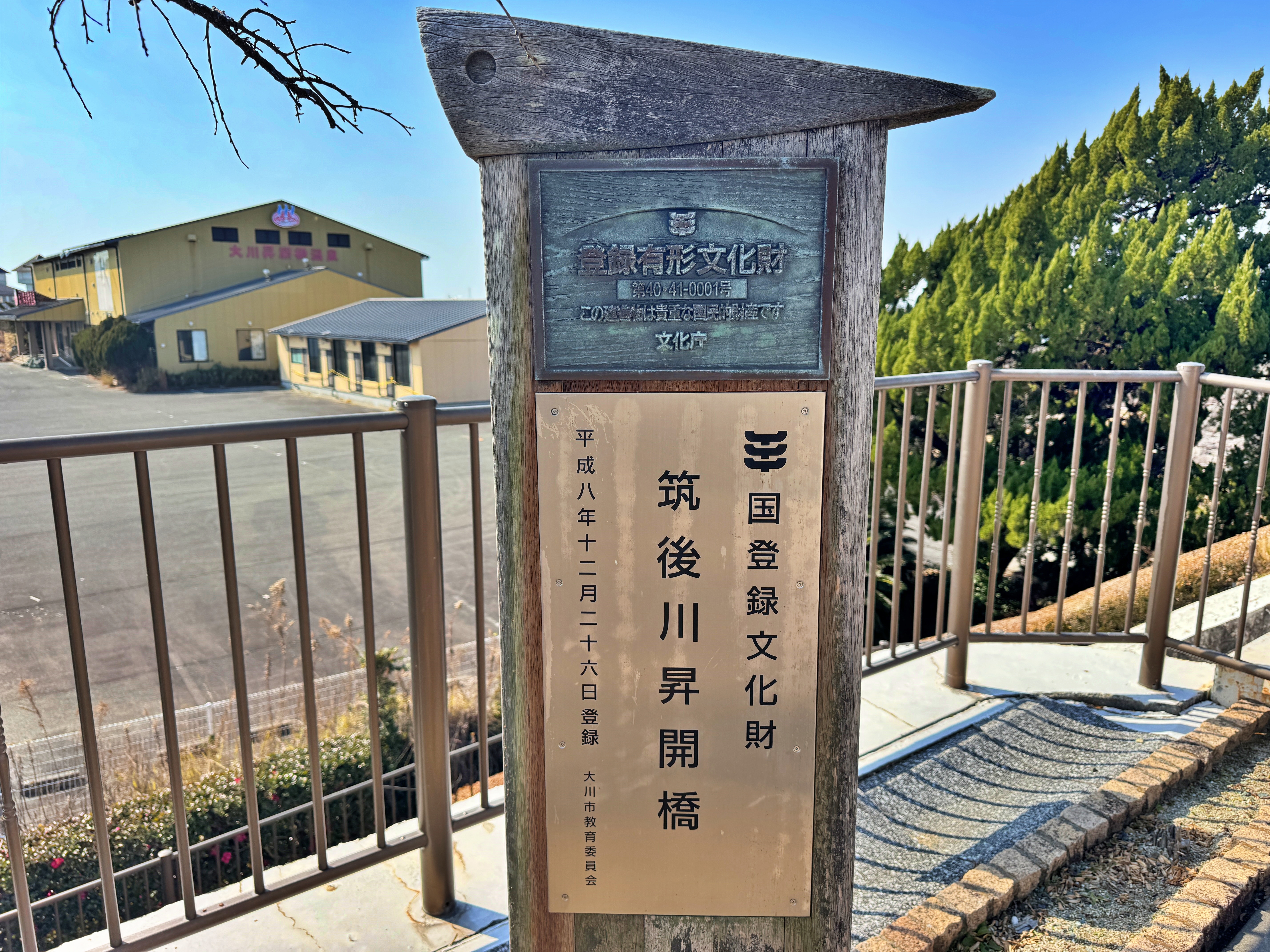 오래된 건물이 보이던 사거리를 거쳐 치쿠고강 승개교 전망공원(筑後川昇開橋展望公園)에 왔습니다. 말 그대로 다리 상판이 위 아래로 승강기처럼 올라가고 내려가는 그런 다리입니다. 비록 사가선 철도는 1987년 폐선되고 사라졌지만 그 자리에 남아있는 치쿠고강을 횡단하는 이 승개교는 1996년 주변의 공원화와 함께 횡단 할 수 있는 산책로가 개통되었고 2003년에 일본의 국가 지정 중요 문화재, 2007년에는 기계유산으로 인정되며 현재에 이르고 있다고 합니다.