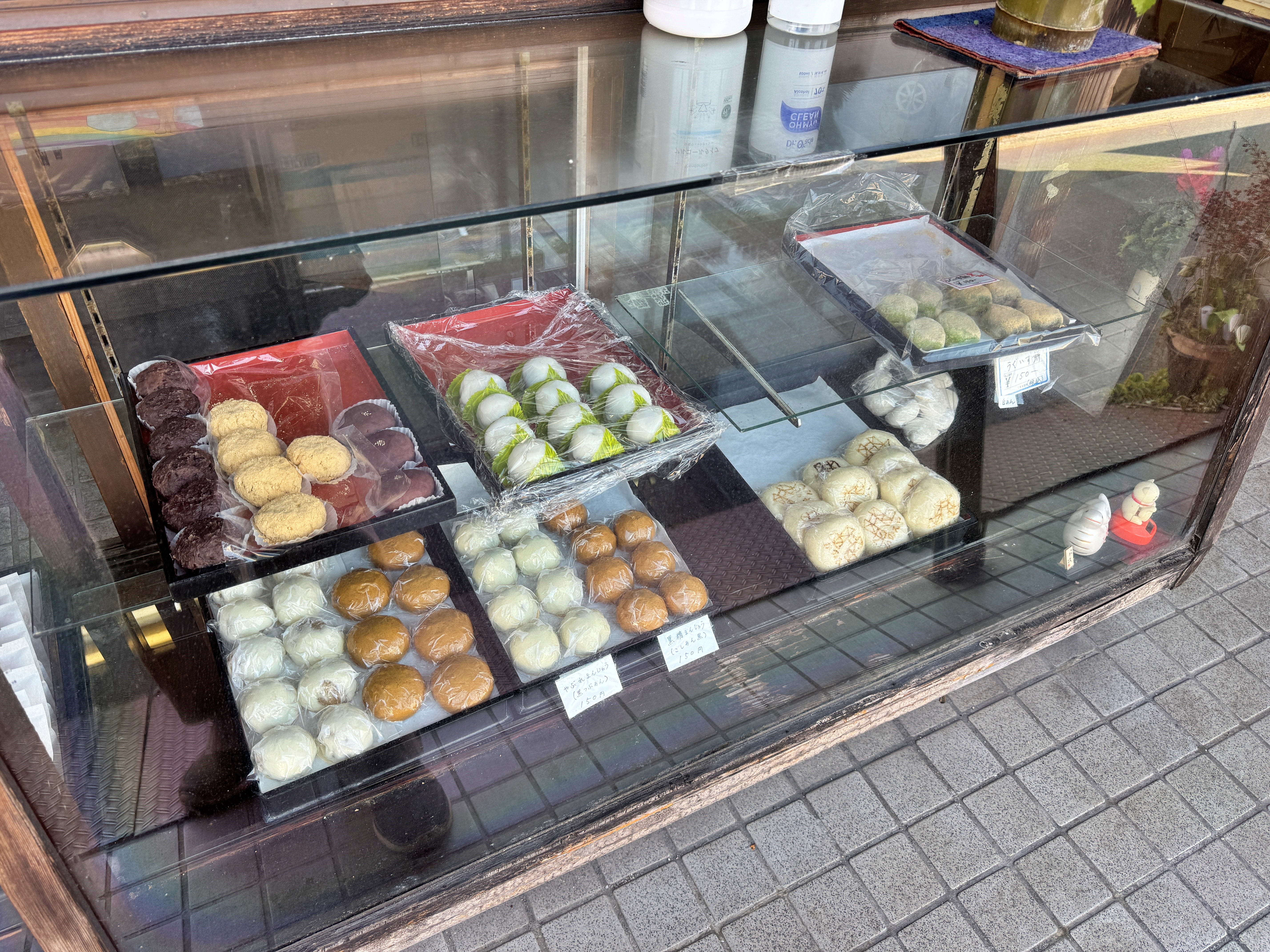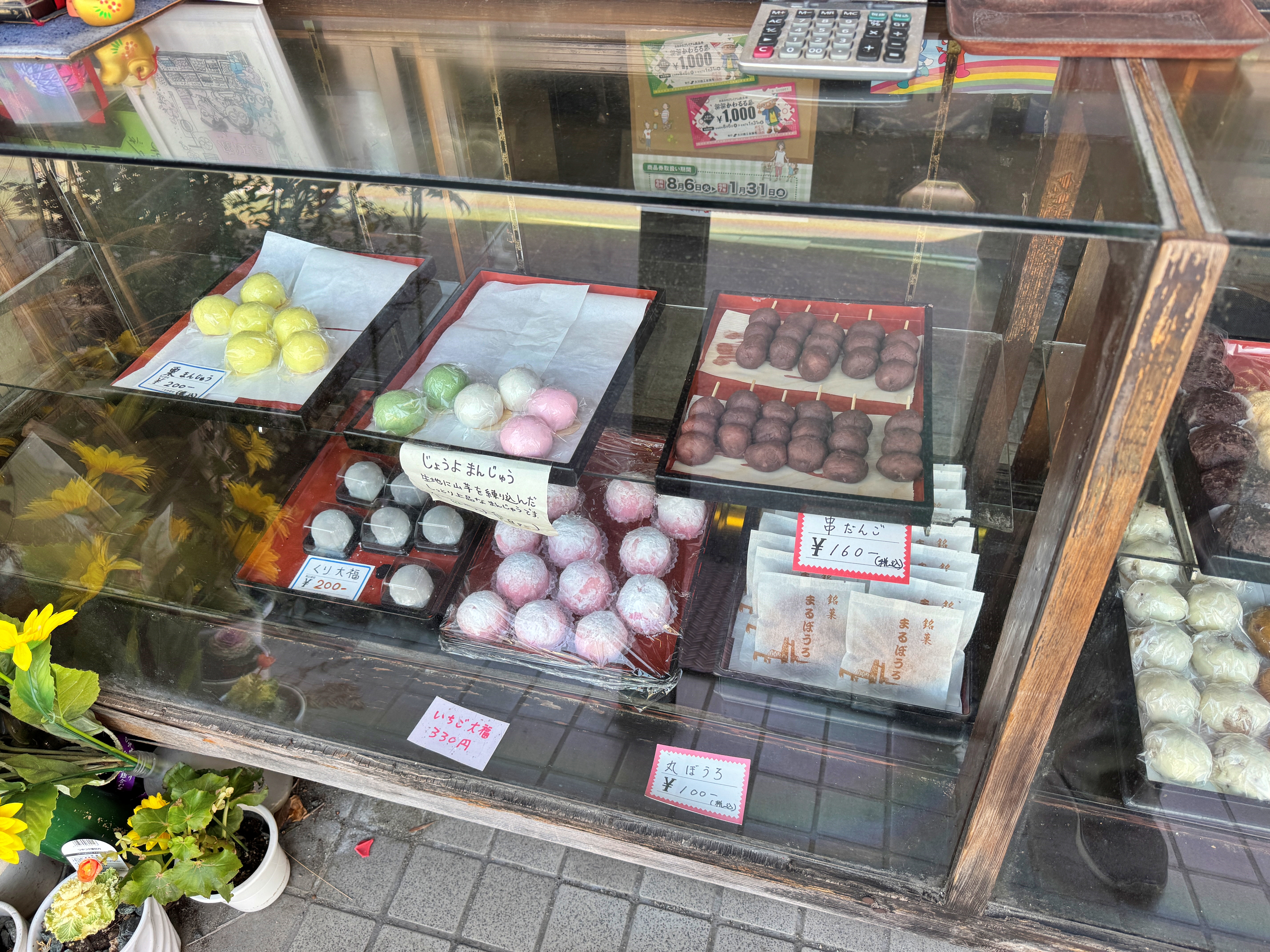 주력 제품은 지역 특산품인 딸기가 들어간 모찌와 당고. 추천을 받아 딸기모찌 하나와 당고 하나를 구입했습니다.