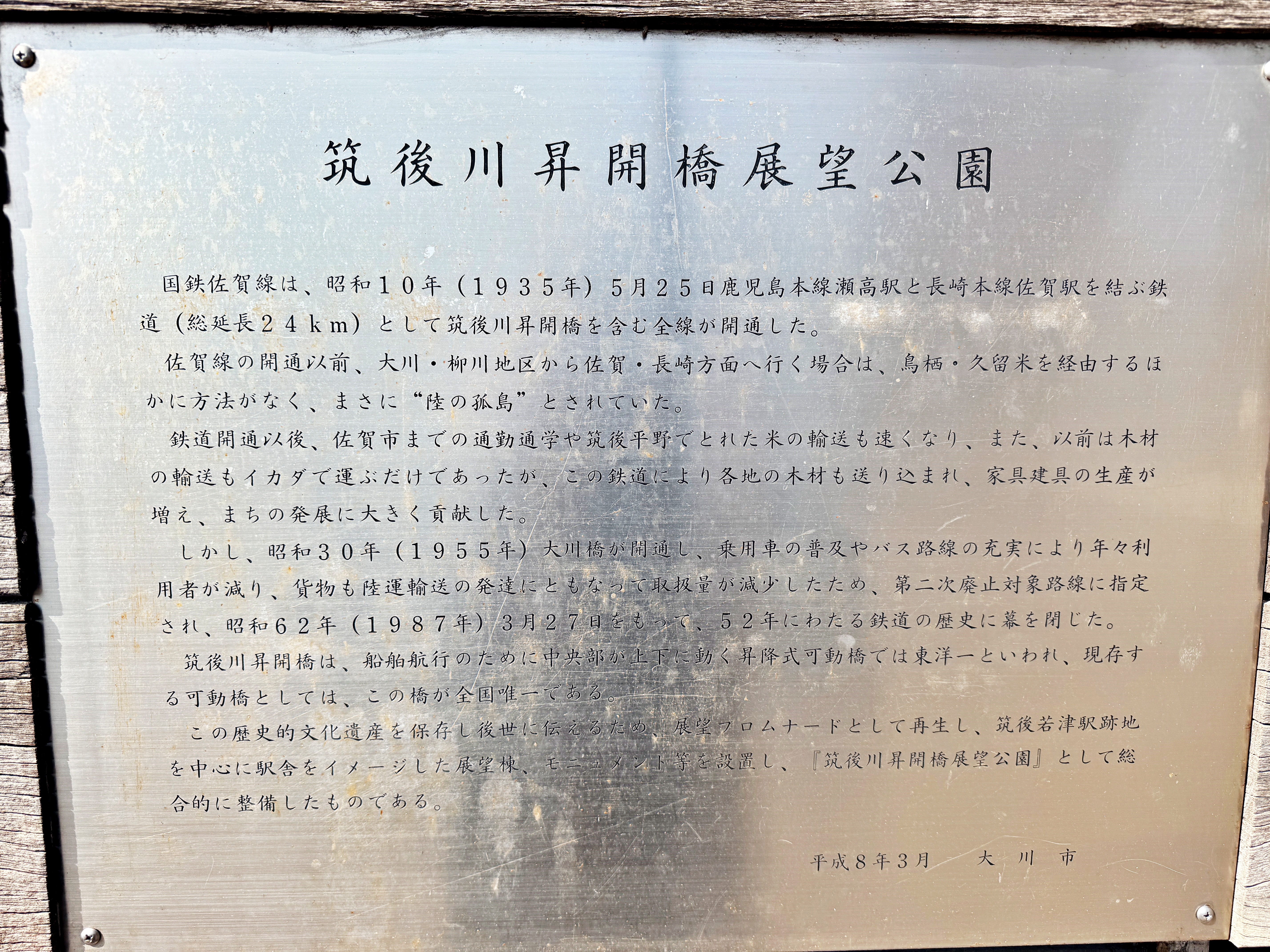 쇼와 10년 5월 25일 가고시마본선과 나가서키 본선을 이어주는 사가선이 개통되었고, 이러한 사가선은 마을 발전에 크게 공헌했답니다. 다만 쇼와 62년에 52년의 역사를 뒤로하고 폐선되었고, 이후 헤이세이 8년에 공원화가 되었다고 합니다. 일본에 현존하는 가장 오래된 승개교이며 근대유산으로 지정되어 지금에 이르고 있다고 하네요.