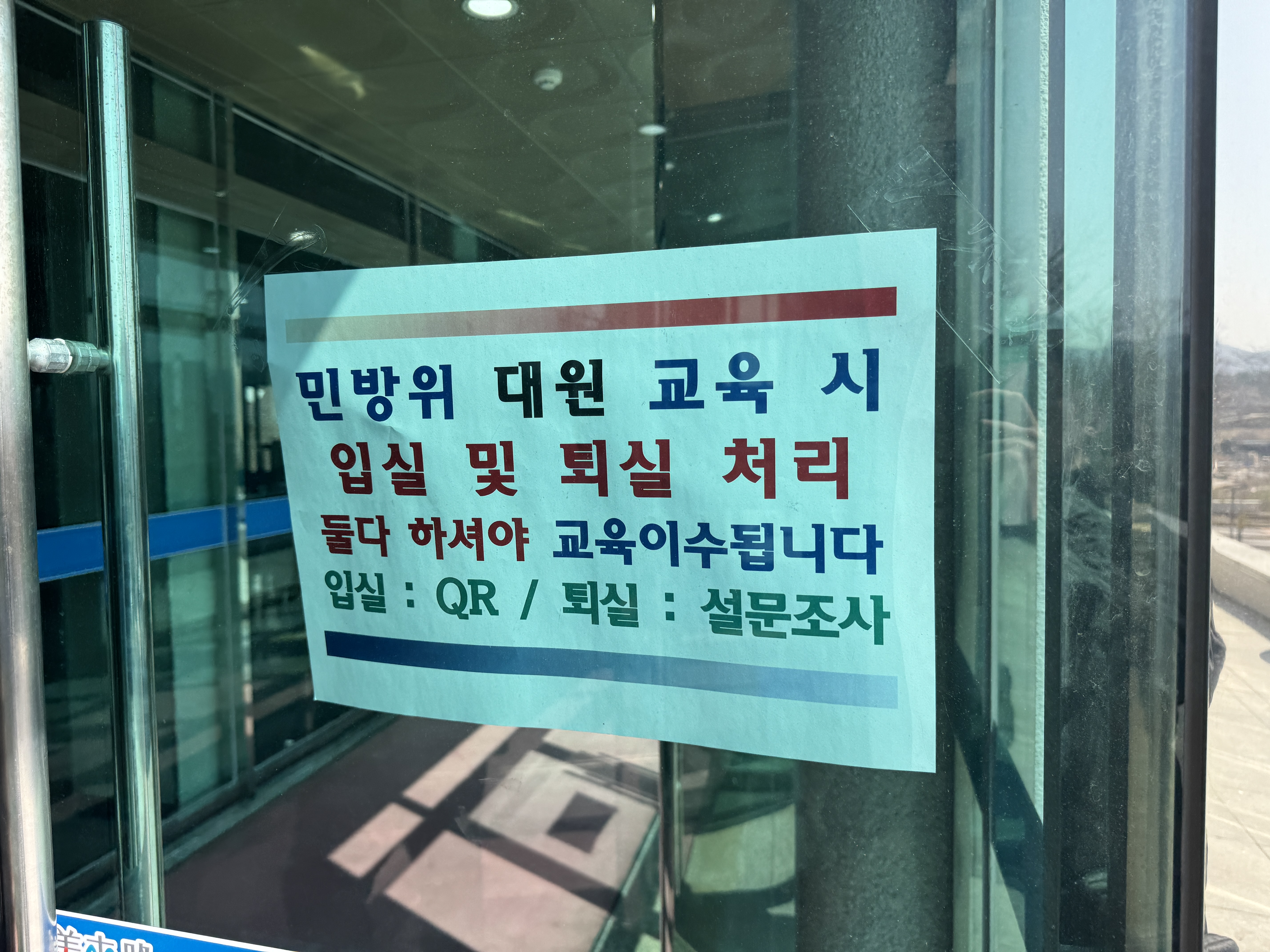 2년 차라 익숙하게 교육장 앞으로 올라오며 민방위 통지서를 켜놓은 뒤 QR코드를 인식시켰습니다.