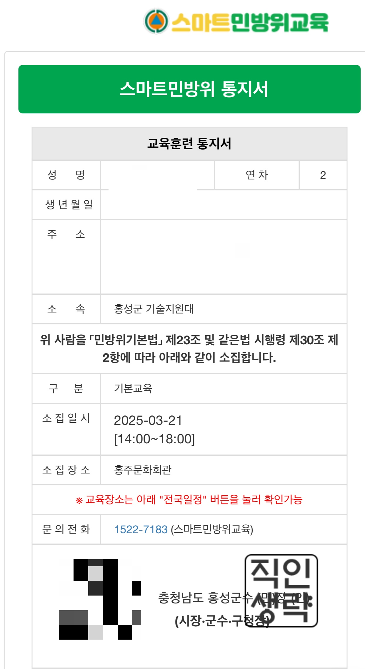 보충교육은 우편으로도 통지서가 왔었는데 정규 교육은 스마트 통지서만 오고 마는군요. 통지서 하단의 QR코드로 입실과 퇴실을 확인하고 체크합니다. 이 QR코드의 인식이 어려운 경우 수기로 체크를 하는데 다행히 1년 차 2년 차 모두 별문제 없이 QR코드를 찍고 들어갔다 나왔습니다.