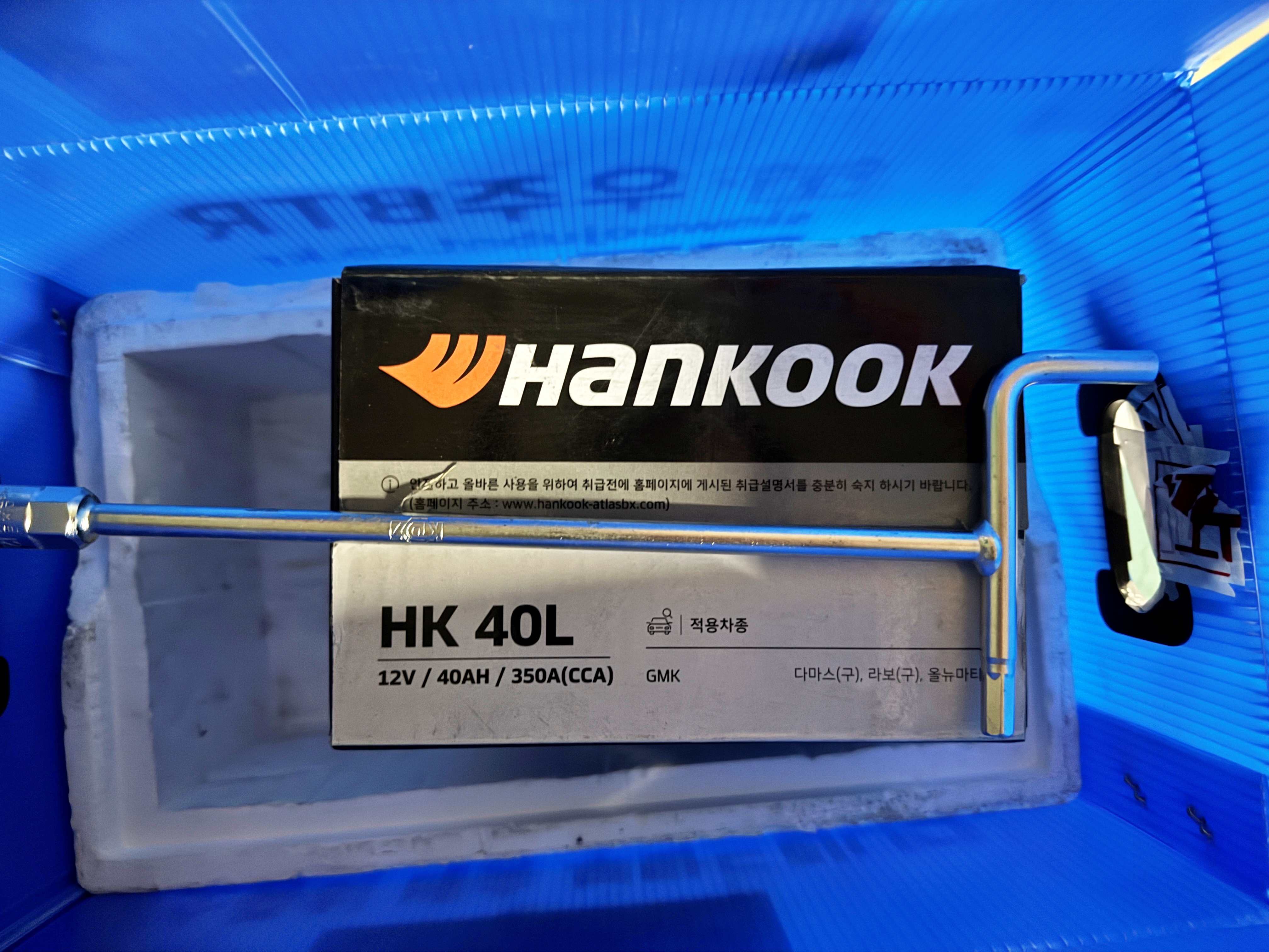 현재 한국 브랜드의 배터리를 생산하는 주체는 '한국앤컴퍼니(주) ES사업본부'입니다. 배터리 브랜드도 아트라스에서 한국(Hankook)으로 일원화되었다네요. 아트라스 배터리와 포장만 달라졌을 뿐 같은 물건이라고 생각하면 되겠습니다. 적용차종은 '다마스(구), 라보(구), 올 뉴 마티즈'라고 적혀있습니다만, 마티즈1,2 티코까지도 모두 호환되는 규격입니다.