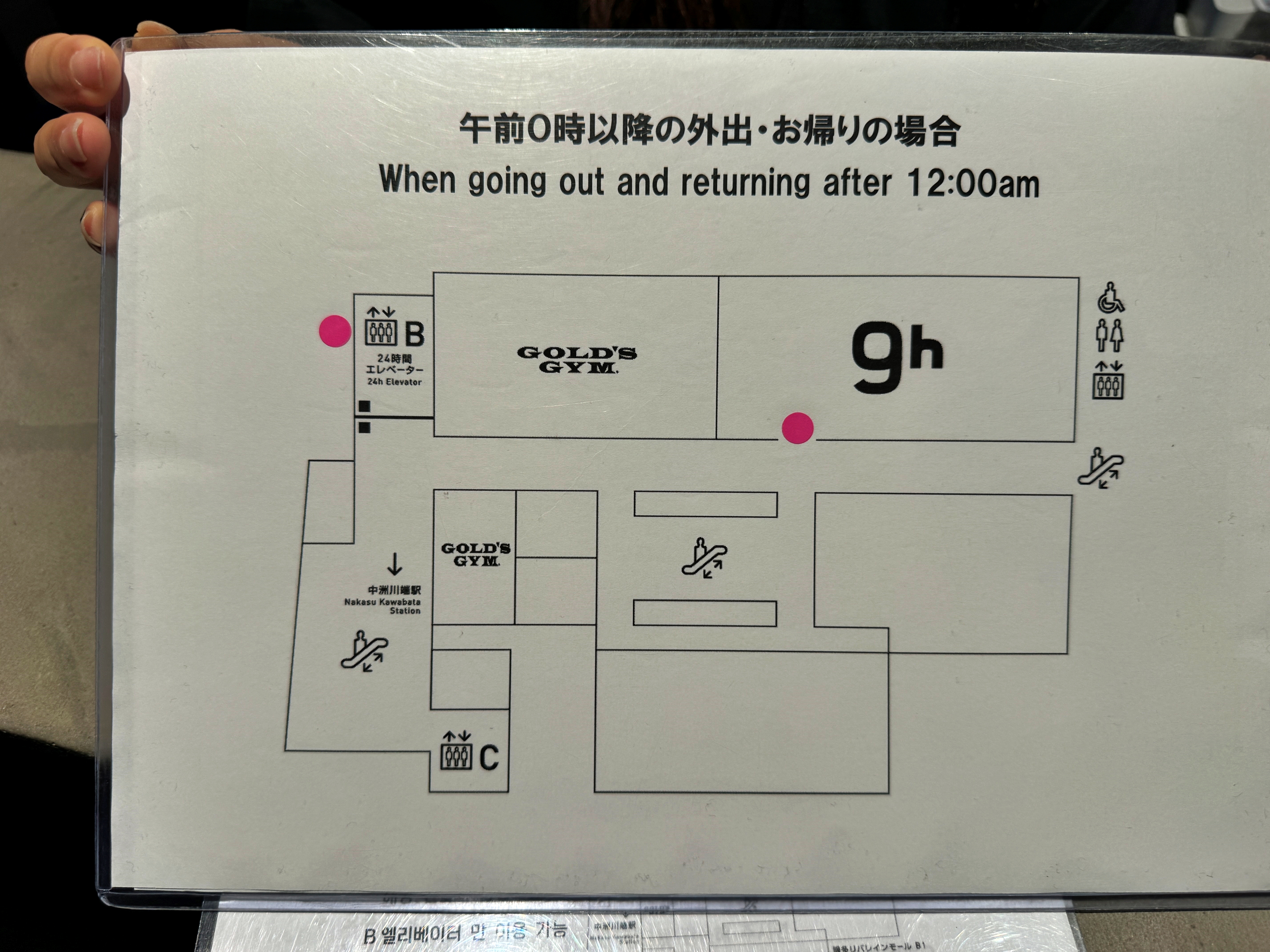24시간 운영되는 캡슐호텔이지만, 자정 이후로는 B 엘리베이터만 이용이 가능하다고 합니다.
