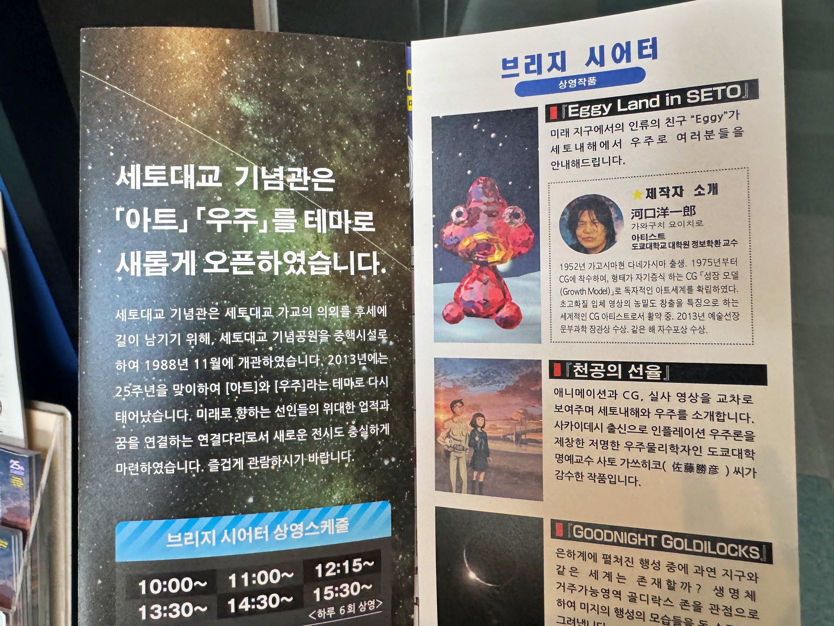 라고 하는데.. 새롭게 오픈했다는 시기가 2013년입니다. 그리고 이 우주를 테마로 한 시설은 기념관 맨 끝에 작은 공간이 거의 전부였고요. 이 기념관의 주요 전시물은 세토대교 건설 이전의 세토해협 연락선이 다니던 시절부터 건설 과정에 대한 모형과 설명들이었습니다.