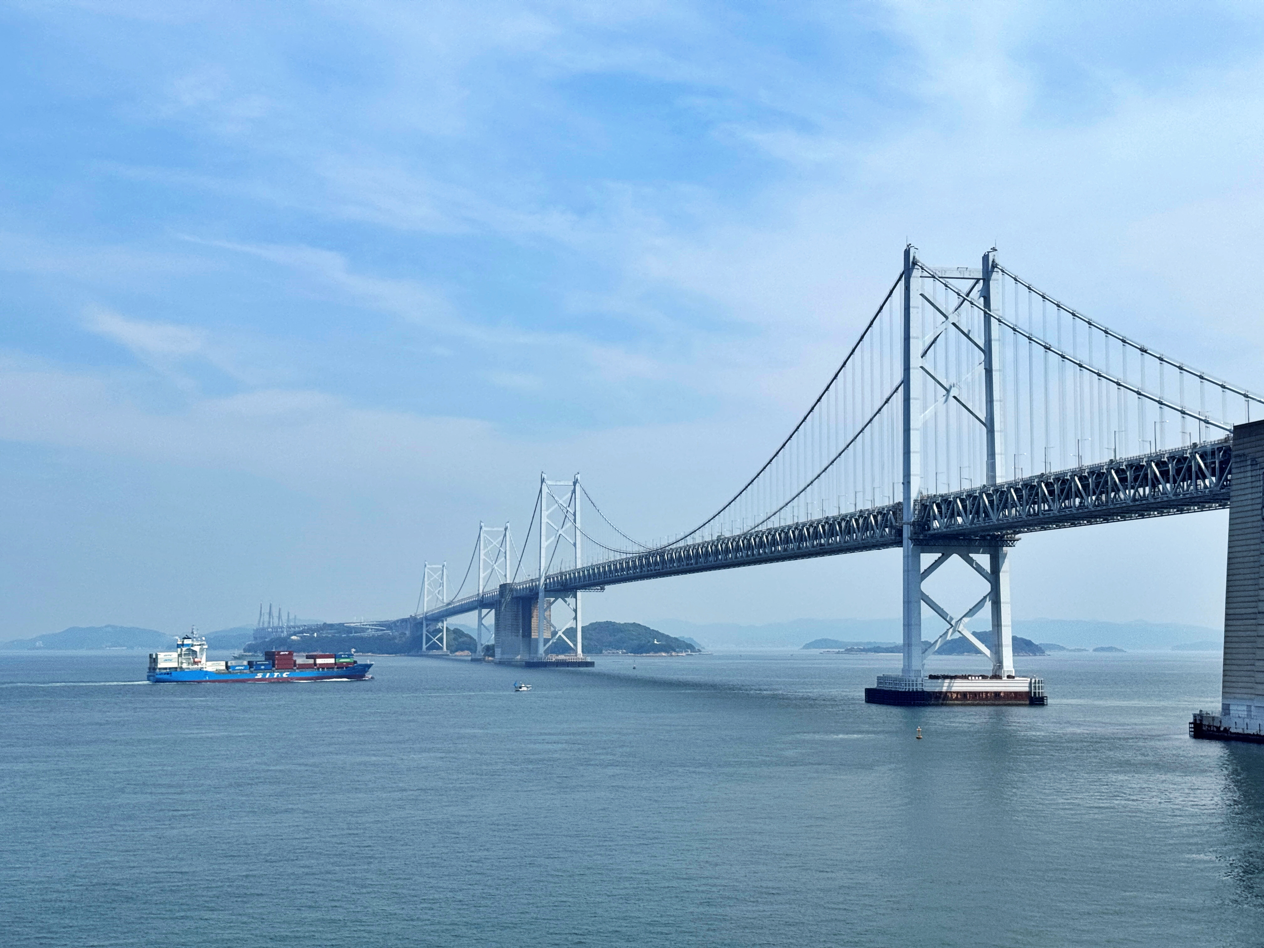 세토대교와 그 아래를 지나는 컨테이너선의 모습이 보입니다.