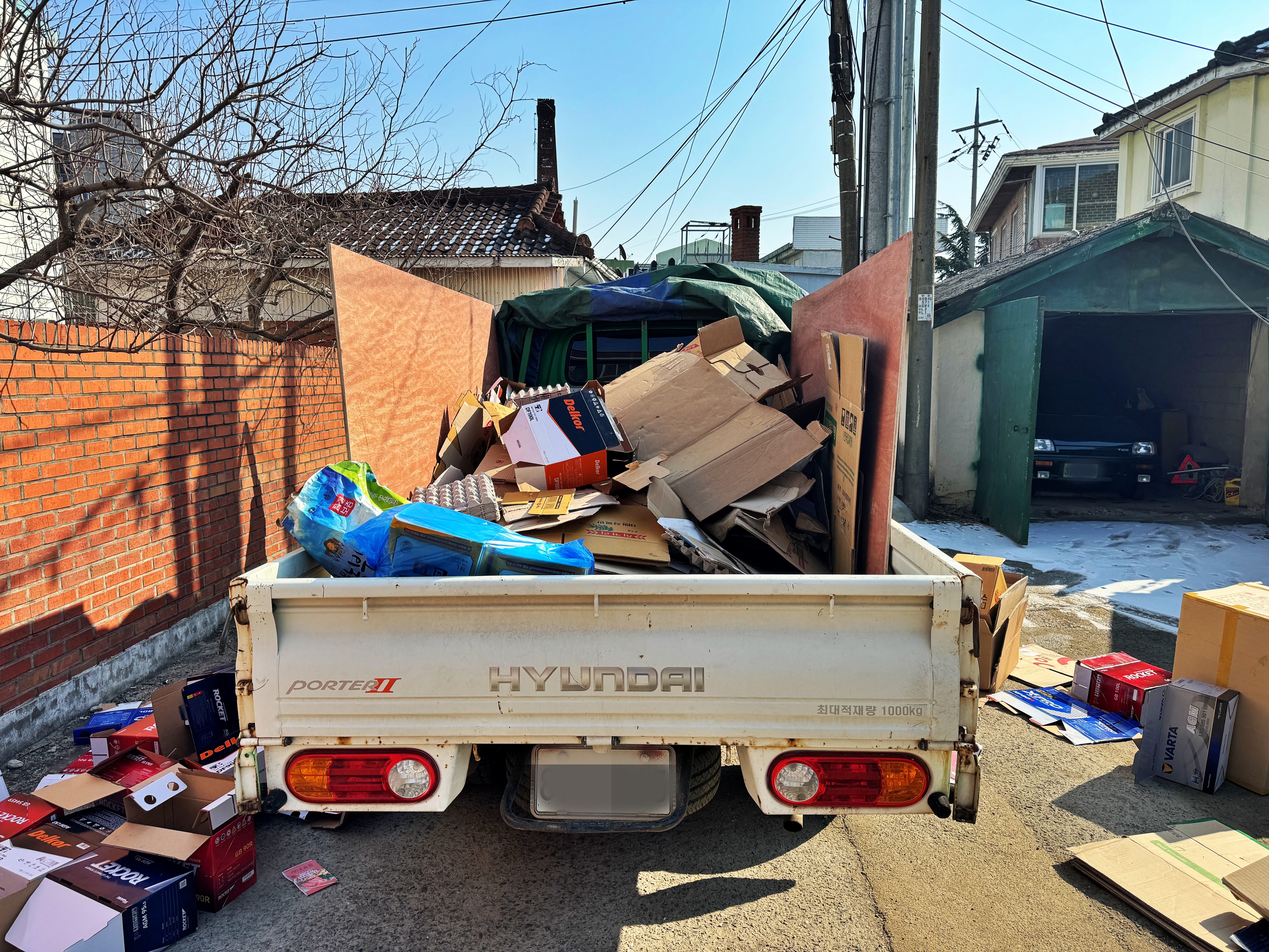 그렇게 배터리를 교체하고 합판으로 가벽을 세운 포터로 또 열심히 운동삼아 폐지를 주웠습니다.