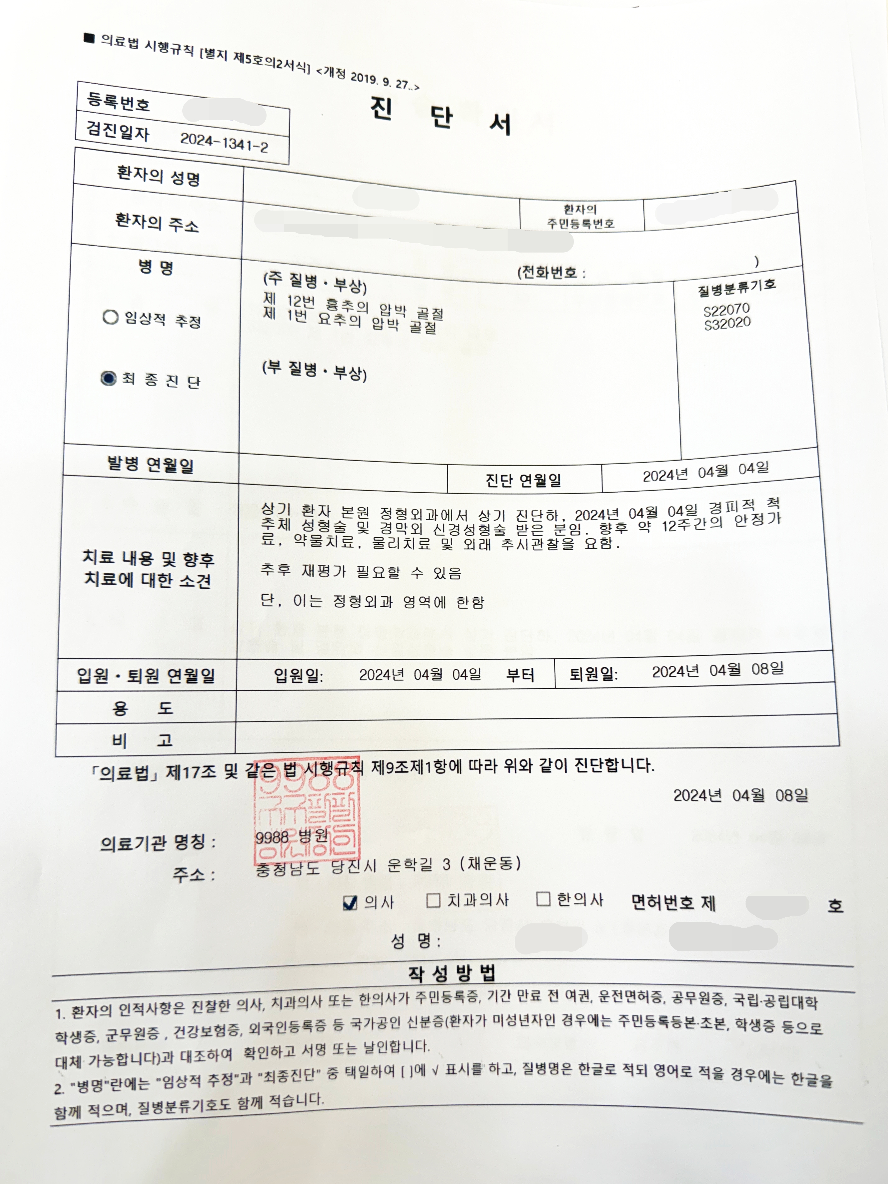 | 240408 당진 9988병원 퇴원+진단서 발급 (0) | 2024.04.09 |