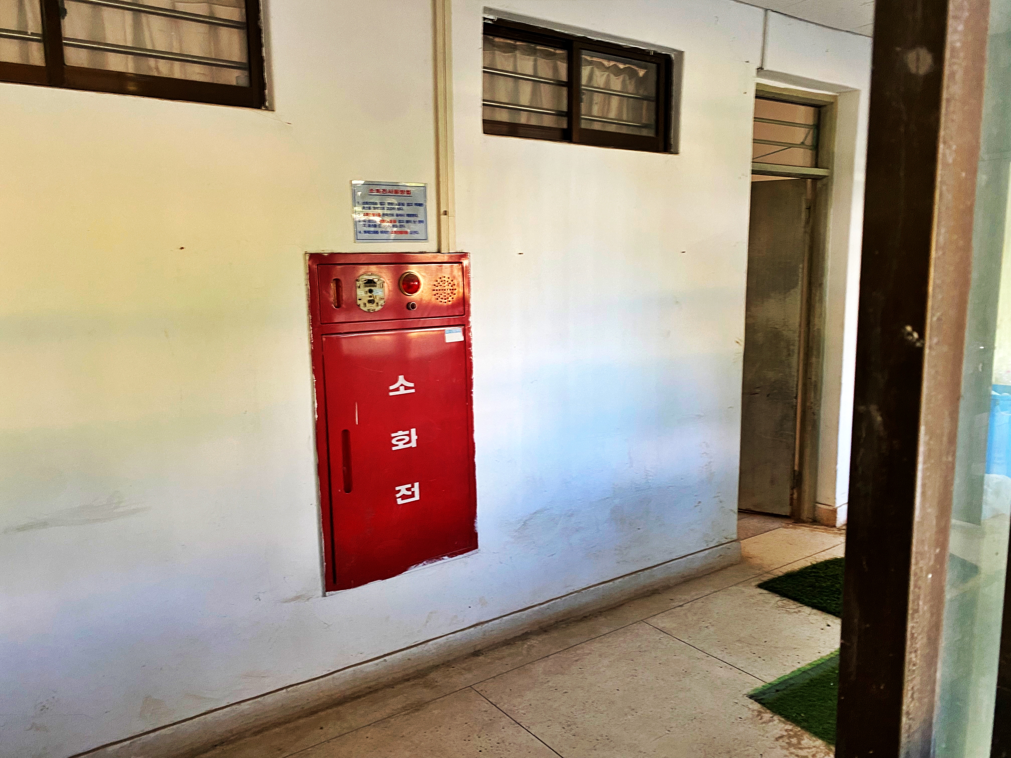 낡은 소화전과 낡은 벽 그리고 열려있는 강의실 뒷문입니다.