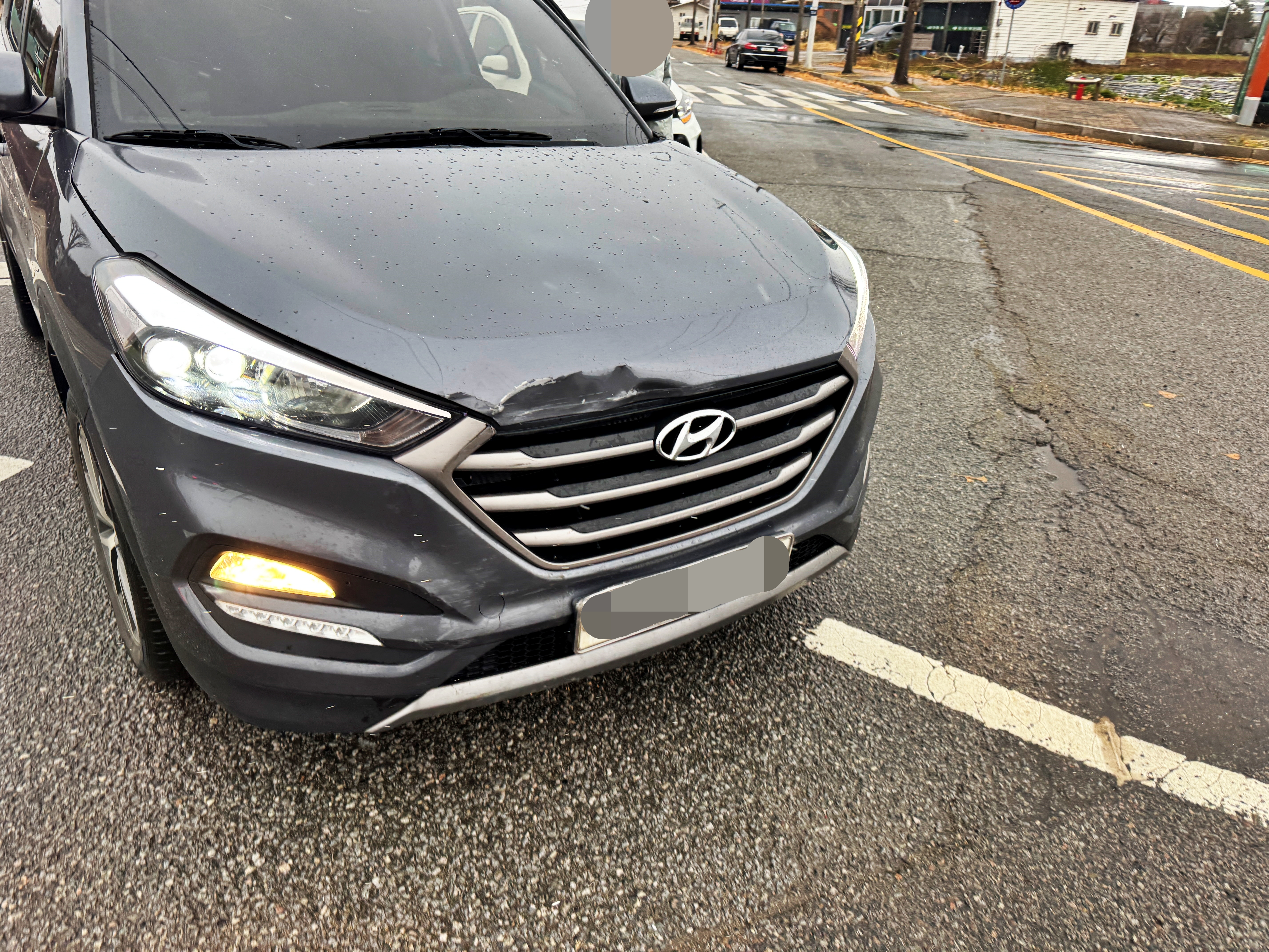 제각기 좌회전을 기다리는 차들이 서있는 모습을 확인하고 직진했는데, 상대 차량이 갑자기 움직이네요. 갑자기 투싼이 움직이는 모습을 보고 경적을 누르며 속도를 줄였지만 경적과 함께 충돌하고 말았습니다.