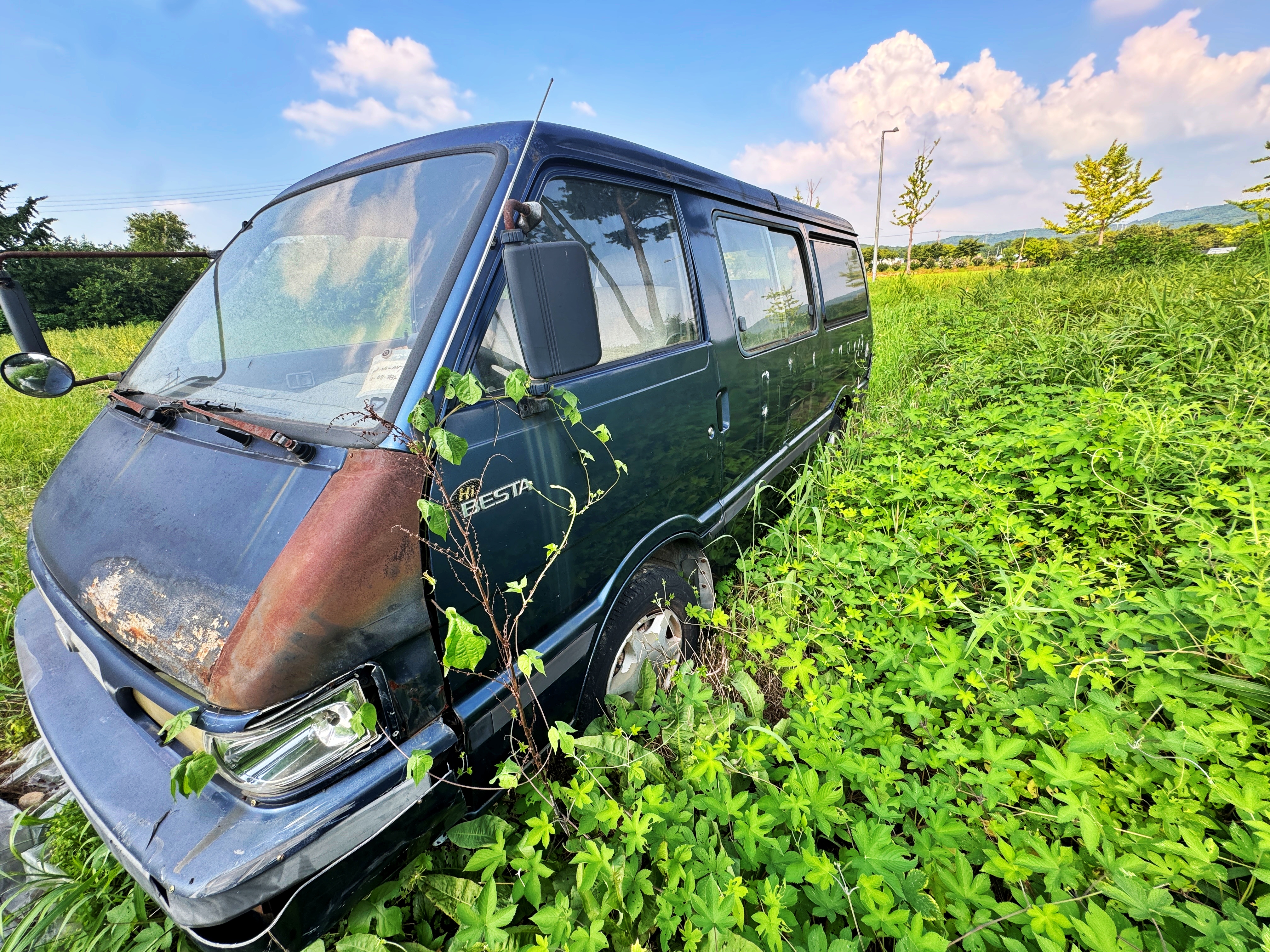 경작지로 활용되는 부지인가 하고 봤더니 현재는 휴경 중이었습니다. 앞 번호판이 없는 남색 빛깔의 베스타 한 대가 세워져 있네요. 무성하게 자란 잡초 사이를 뚫고 베스타에 가까이 다가가 봅니다.