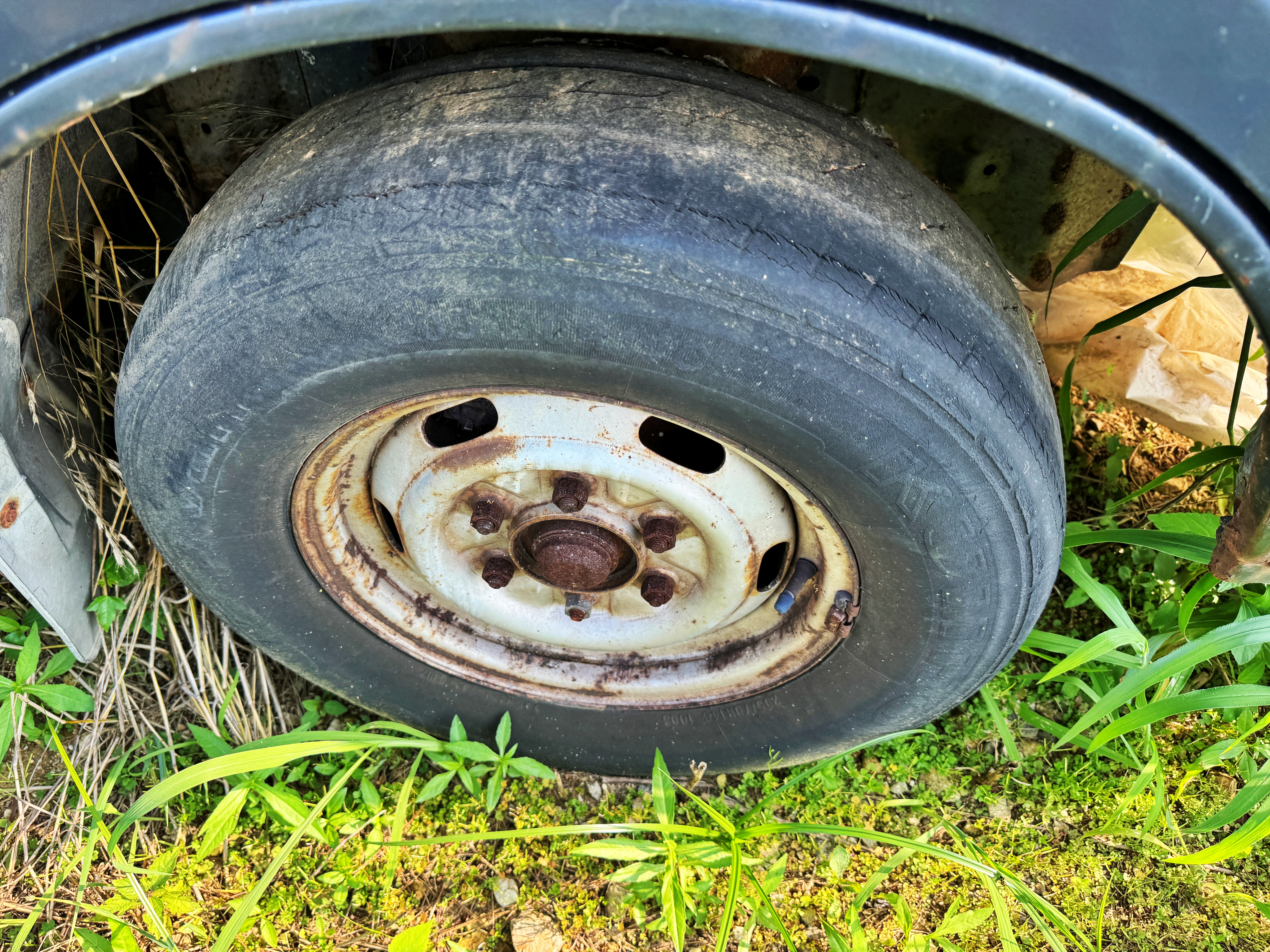 특유의 6홀 스틸휠과 이미 다 닳아버린 타이어가 보입니다.