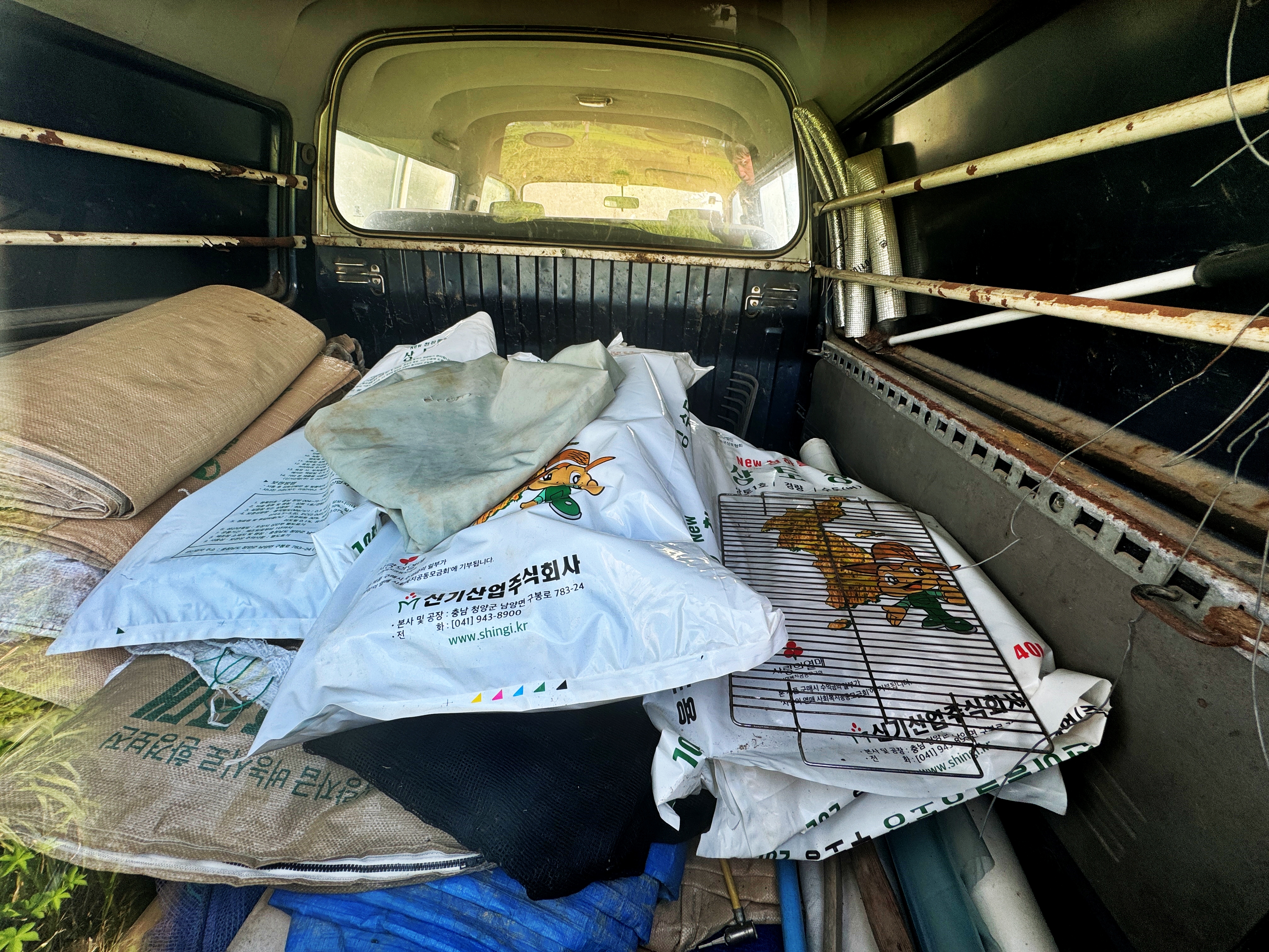 글라스밴이 아닌 판넬밴이라 트렁크를 통해 내부를 확인했습니다. 상단에 보이는 퇴비포대 아래로 지퍼가 달린 조곡용 마대가 여러 장 있네요. 현재 이 차량이 세워진 부지가 휴경 중인 상황인지라 올해는 사용하지 않았을지라도 지난 수년간은 사용되었을 겁니다.