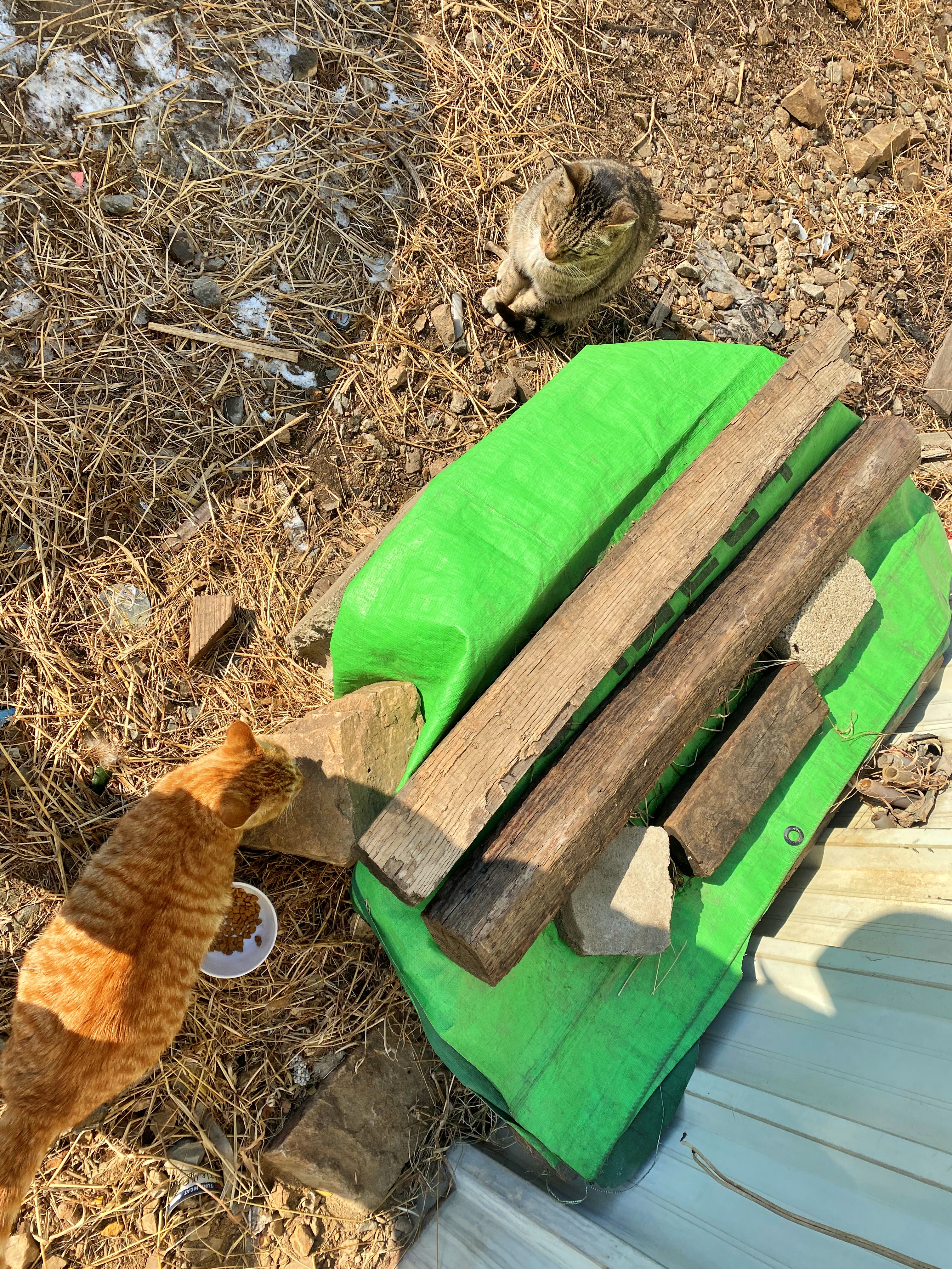 사무실 앞에 세워두는 승용차 범퍼나 타이어에도 몸을 비비고, 금방 자기 영역이 된 느낌이더군요. 굴러다니는 벽돌과 나무를 이용하여 사무실 문 옆에 집도 지어주고 본격적으로 사료를 구입하여 밥을 주기 시작했습니다. 놀아주는 사람도 있고 밥도 나오고 집도 생겼으니 고양이 입장에서는 생존 걱정은 하지 않아도 될 상황이지요.