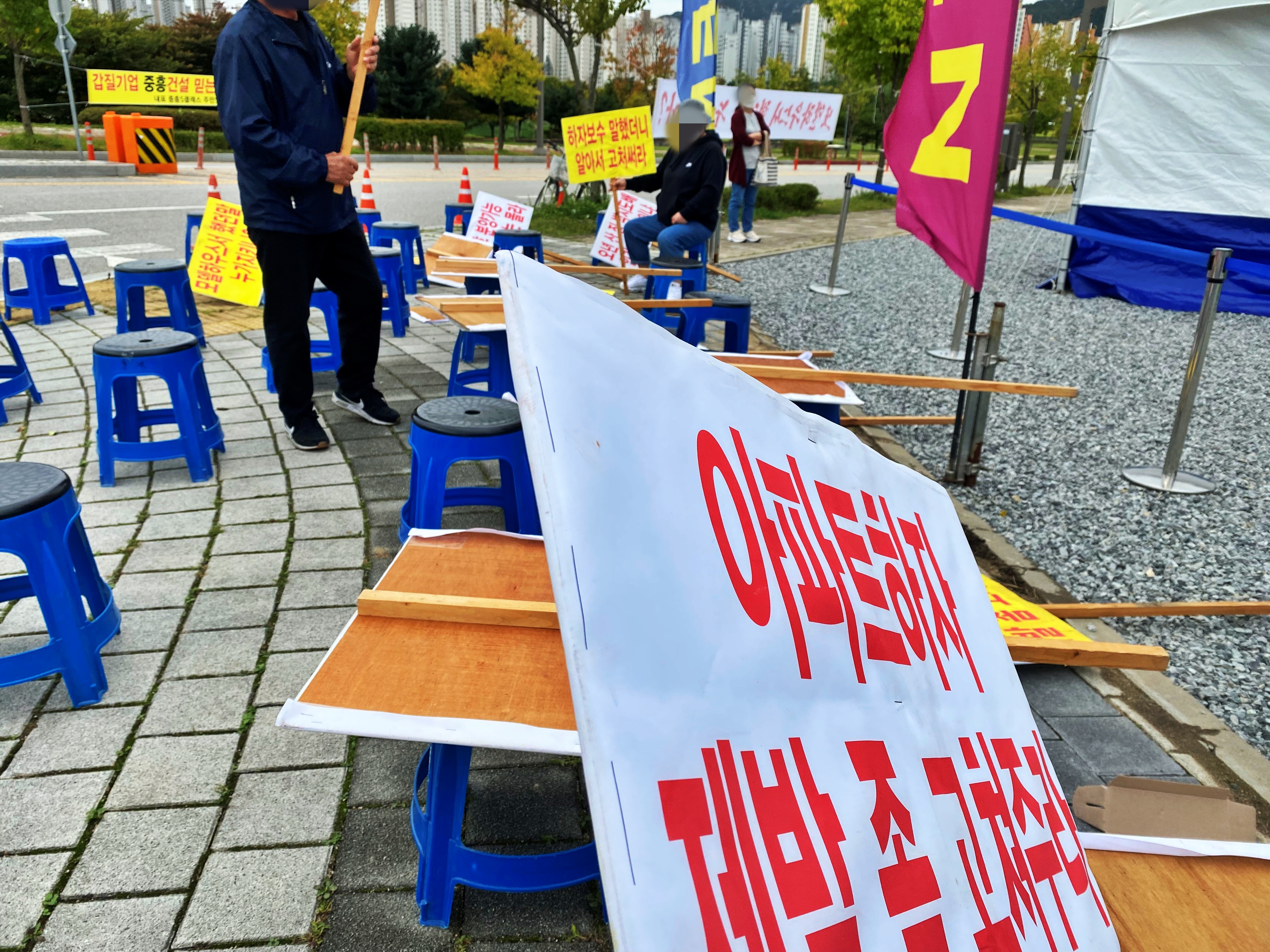 그렇게 자리에 앉아 조금 기다리니 하나 둘 사람들이 모이기 시작합니다. 5년 임대 후 분양전환이라는 얘기를 듣고 들어왔던 입주민이 태반이고, 하자보수를 요구했지만 수년째 미온적인 태도로 반응하던 중흥건설이 기존 입주민들은 놔두고 또 새로운 아파트를 지어 분양한다는 사실 자체만으로도 큰 분노를 일으킵니다. 1군 건설사인 대우건설까지 인수한다고 나오며 회사는 사세를 확장하고 있지만, 그 회사에서 분양한다는 아파트를 믿고 입주한 입주민들은 회사는 뒤통수만 얻어맞고 있습니다.