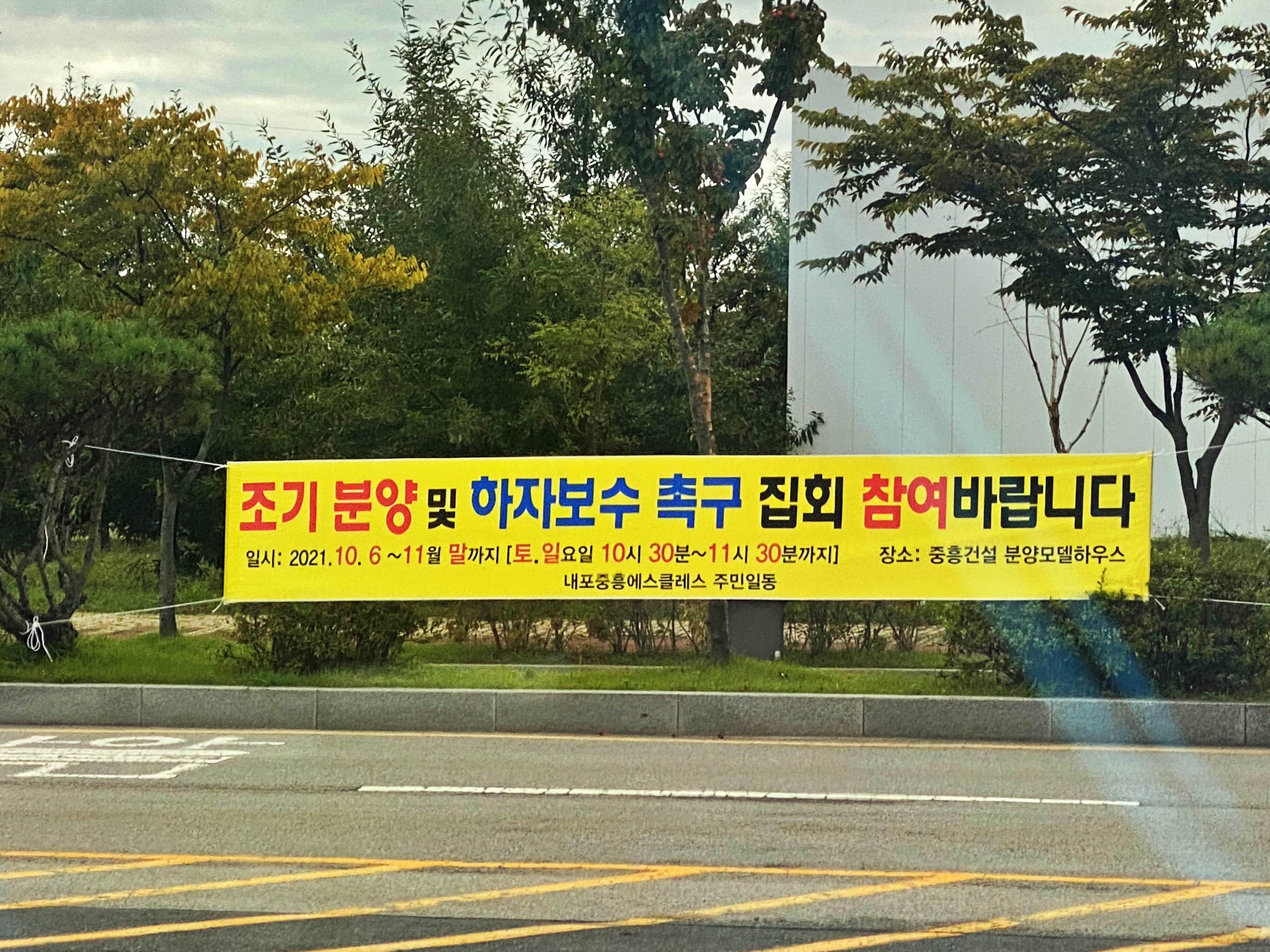 내포신도시 예산군 지역에 중흥건설이 그동안 짓는다고 얘기만 했던 아파트를 건축한다는 사실은 이전에 알게되었고 시위를 했다는 한다는 뒤늦게 아파트 카페와 밴드를 보고 알았습니다만, 주중에 아파트 정문과 후문 앞에 시위를 한다는 현수막이 걸려있어 입주민의 한 사람으로 시위에 참석하고 왔습니다.