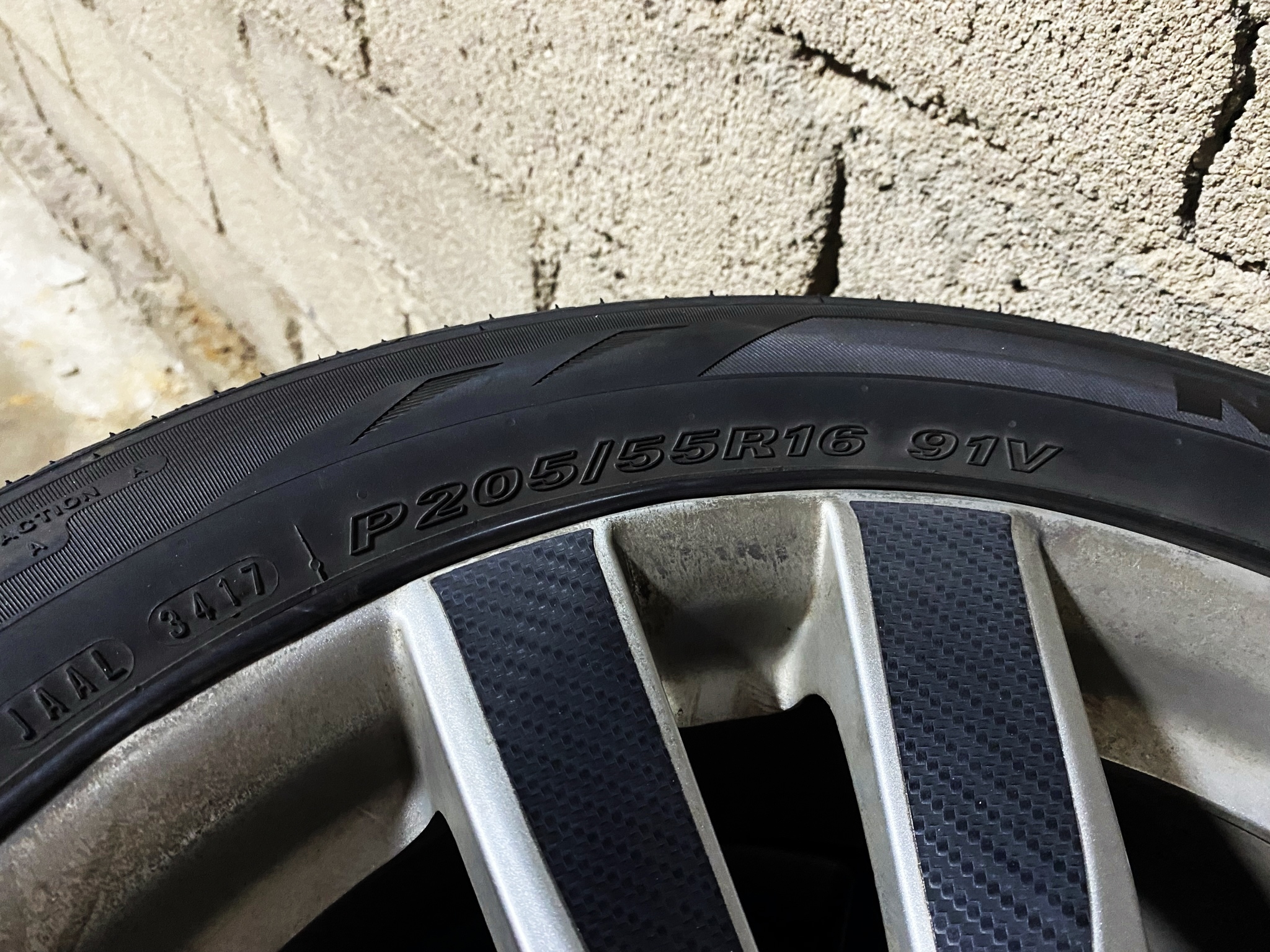 타이어 사이즈는 205/55R16. 17년 34주에 생산된 타이어입니다.