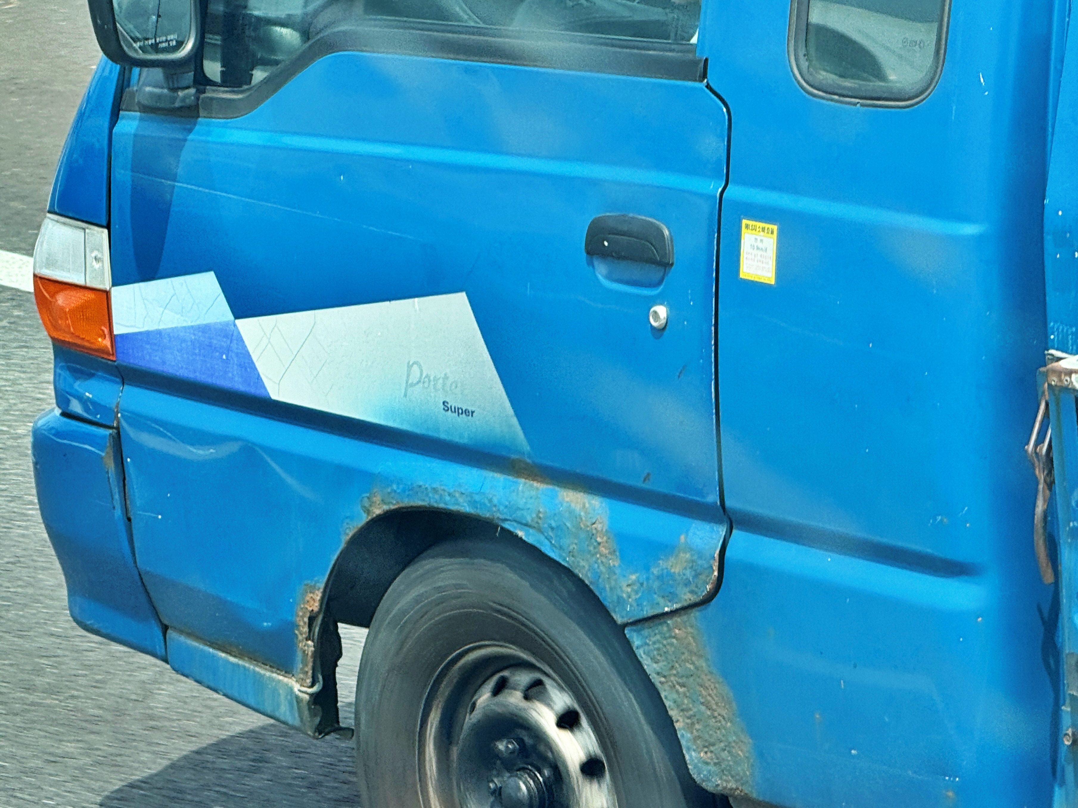 한 번 판금을 했었는지 속에서 녹이 올라와서 퍼티가 깨진 부분에 덧칠을 했던 흔적도 보이고요. 문짝의 경우 제치로 보이지만 세월이 흐르며 칠이 바래며 녹이 올라오고 있었습니다. 그렇지만 그 시절 미쓰비시 차량들의 라이선스를 받아 생산했던 현대 트럭에서도 공통적으로 볼 수 있던 특유의 문짝 도색은 잘 살아있네요.
