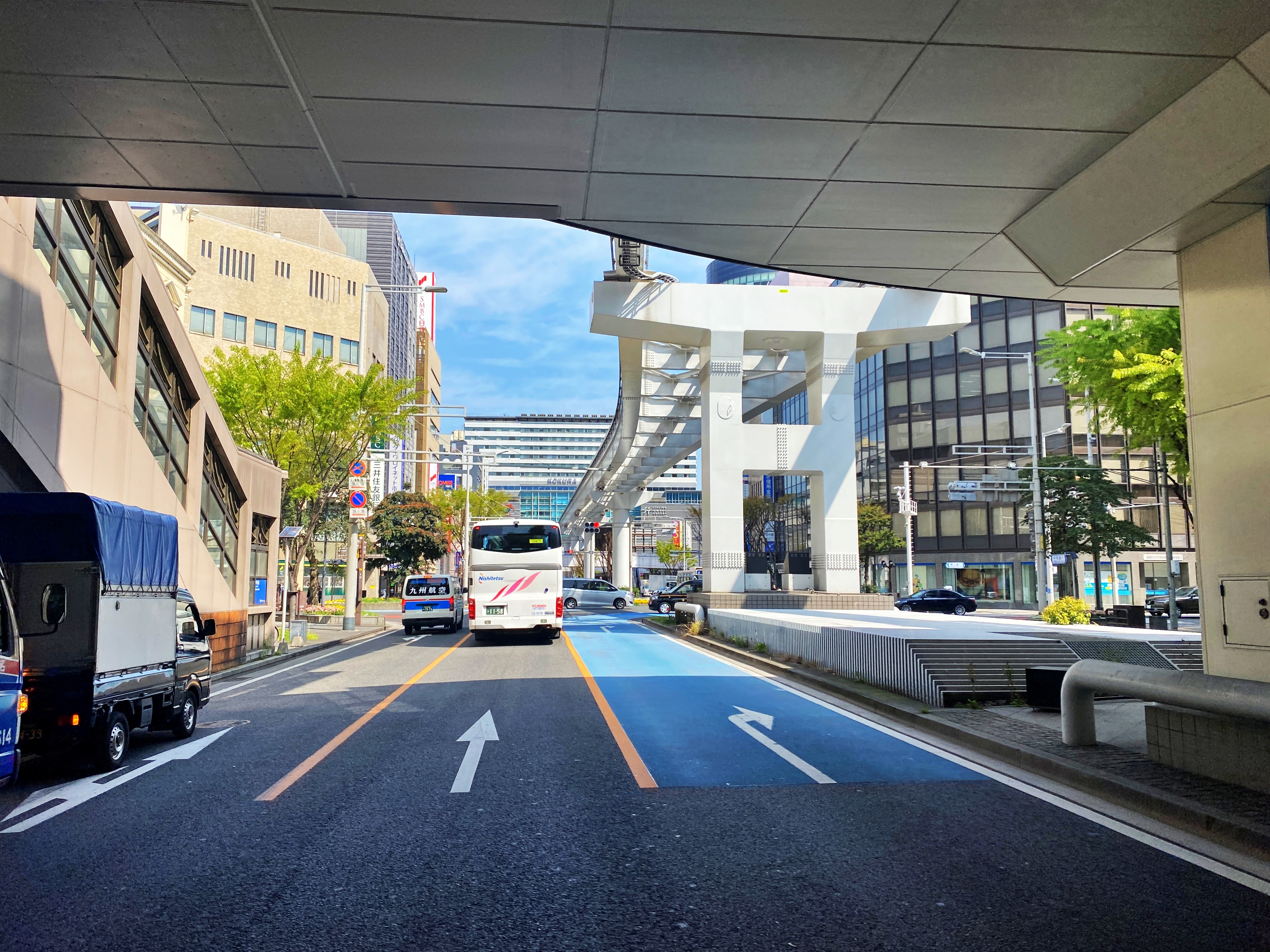 모노레일 선로 아래로 커다란 육교가 있어 그 육교를 타고 버스정류장 방향으로 넘어갑니다.