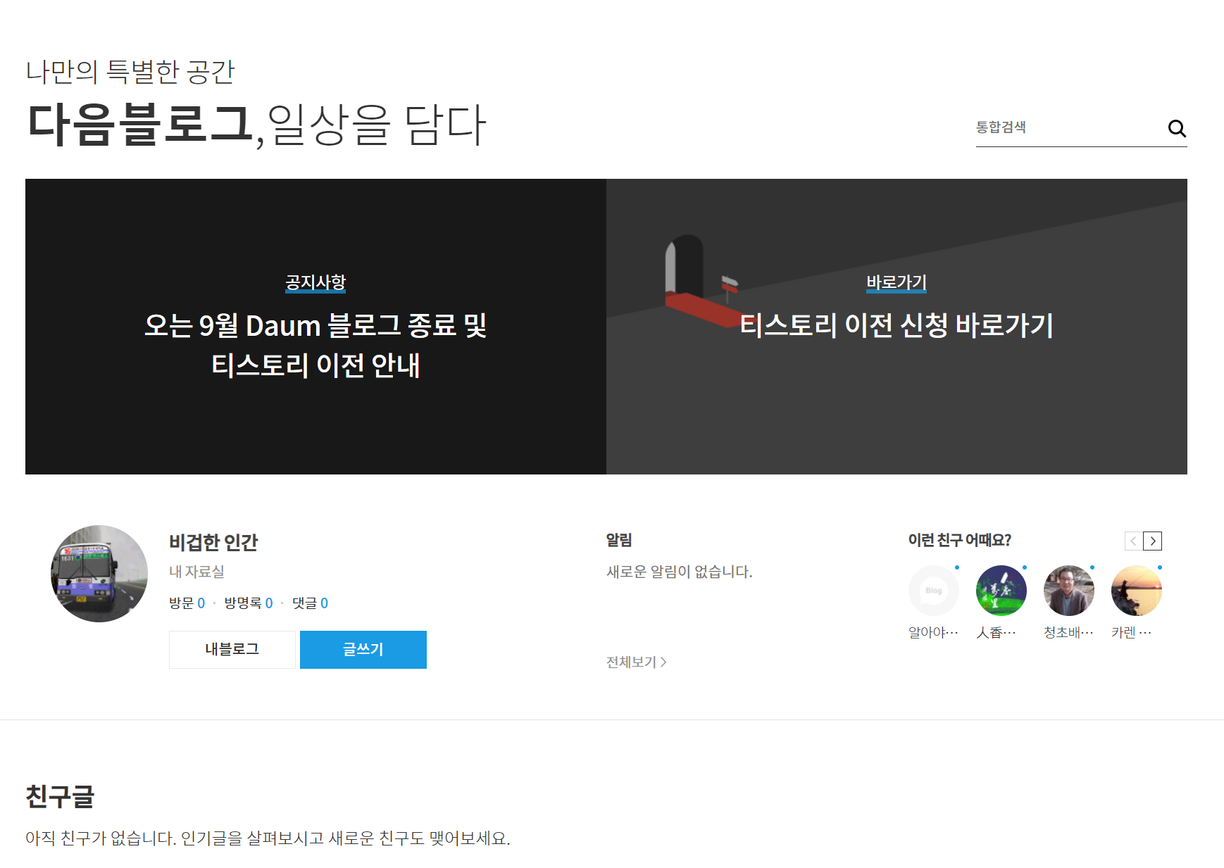 이 문구가 사라지면 티스토리에서 다음 블로그에 작성했던 포스팅을 볼 수 있겠죠. 이용자가 현저히 줄었지만, 지금껏 꾸준히 다음 블로그를 운영하셨을 분들도 꽤 계시리라 생각됩니다. 티스토리도 떠나는 사람이 많은 마당에 언젠가는 이 서비스에서 쫓겨날지도 모르겠습니다만, 그래도 저는 여기서 뼈를 묻으렵니다.