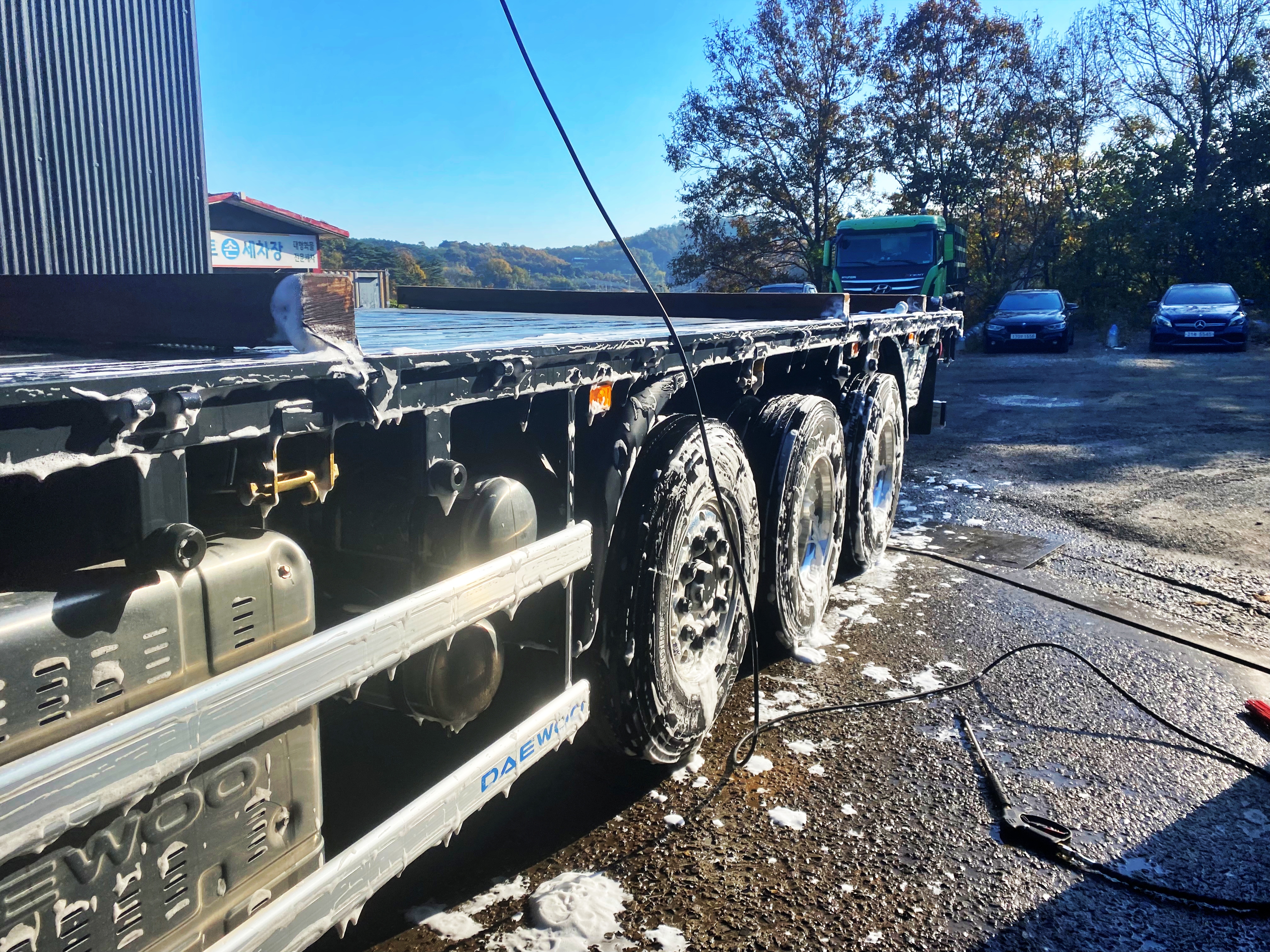 일반 승용차용 셀프세차장과 비교하면 수압차이가 엄청납니다. 아무리 수압이 쎈 셀프세차장을 가도 이 수준은 아녔습니다. 그냥 수압만으로도 휠에 끼어있는 때가 빠지는 수준이네요. 제 삼각떼처럼 랩핑이 된 차량들은 잘못뿌리면 다 날라가고도 남을 수준의 수압입니다.
