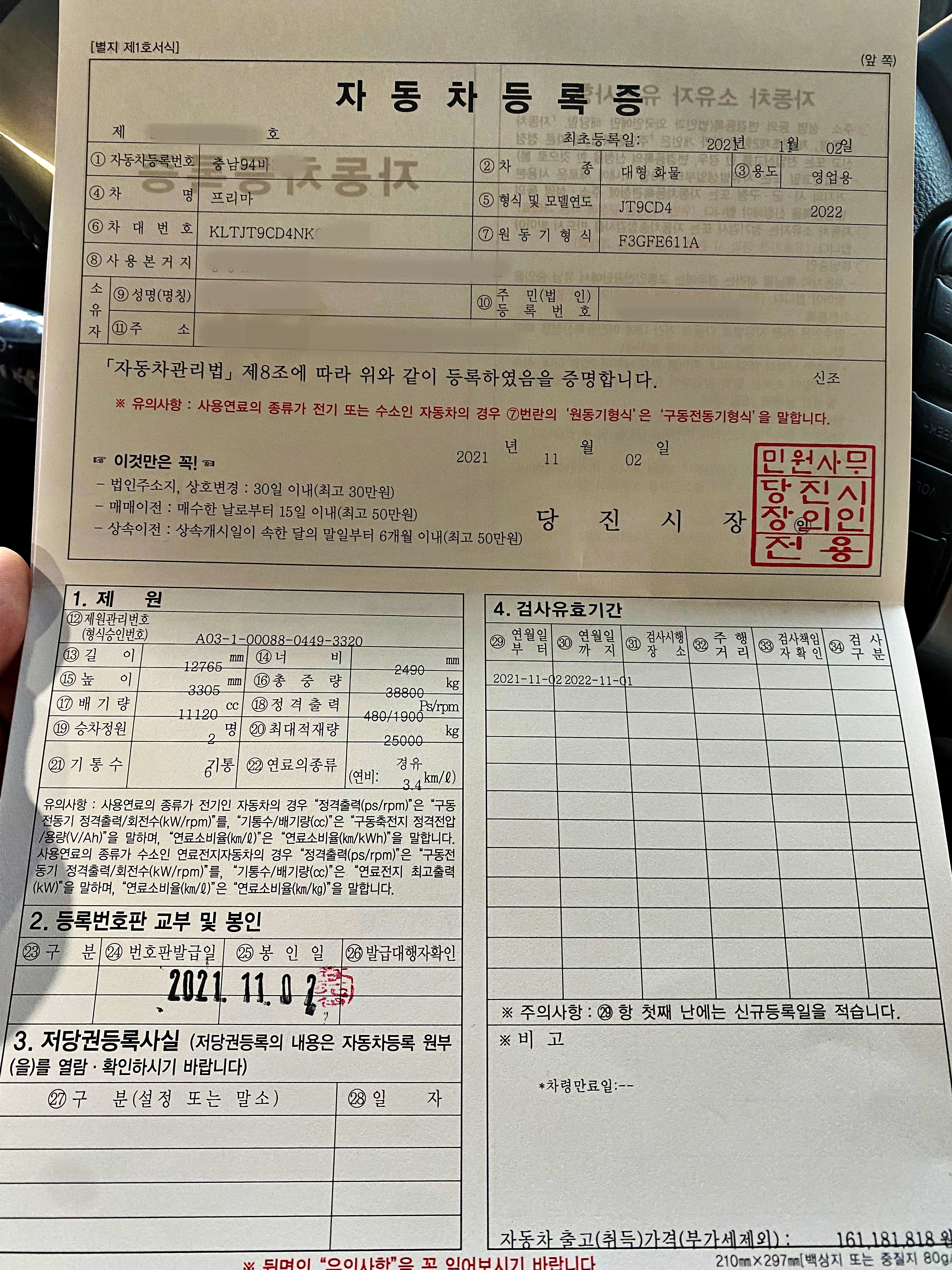 영업용 차량을 계속 임시번호판만 달고 다닐 수 없는 노릇이니 지난 화요일에 차량을 등록했습니다.