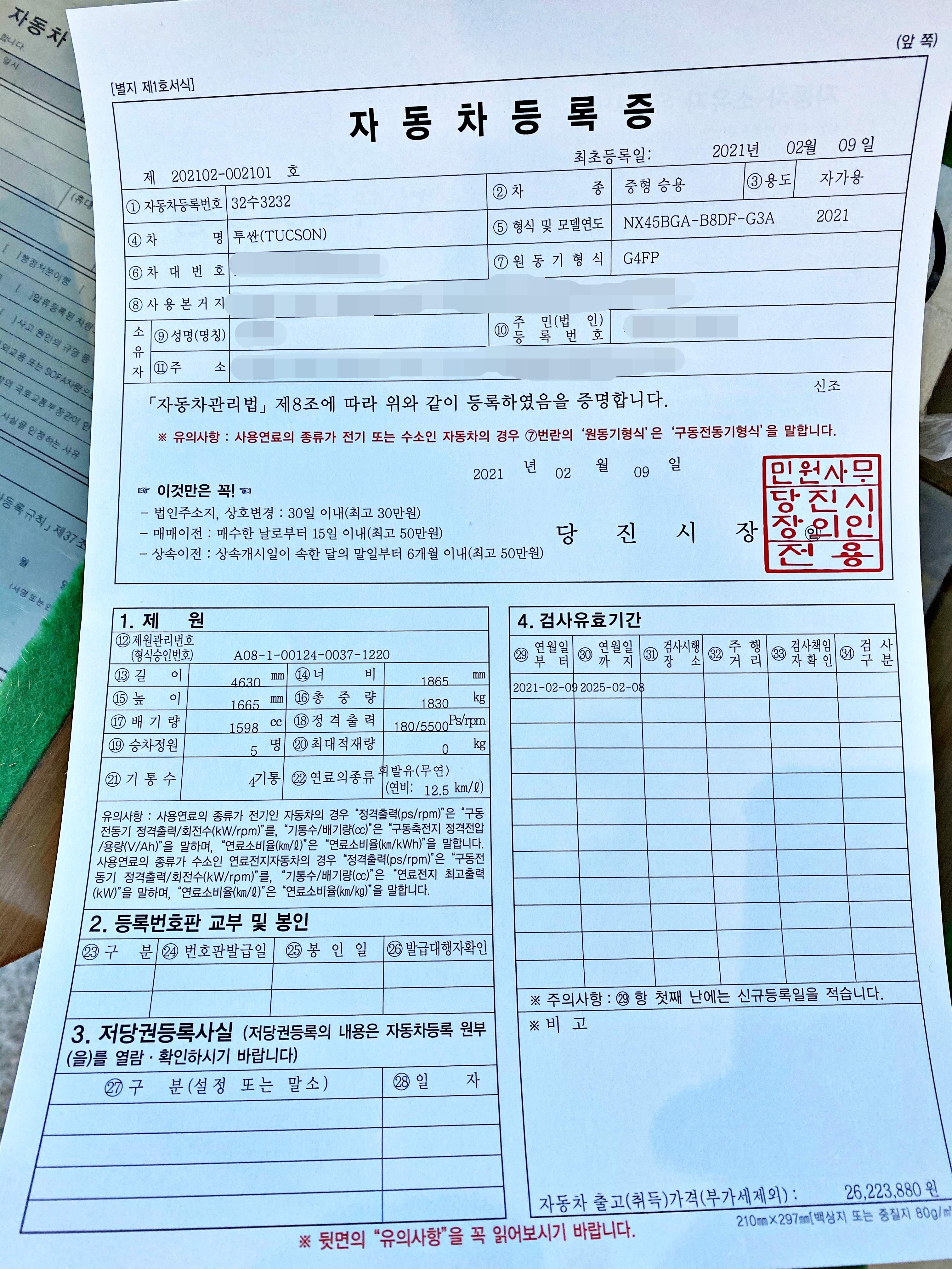 농어촌특별세와 지방교육세 없이 취득세만 183만원이 나왔습니다. 과세물건에도 정확히 32수 3232로 잡혀있네요. 99년식 마티즈가 대략 한 달도 채 지나지 않은 시점에서 21년식 투싼으로 화려하게 환생했습니다. 저 역시도 이론으로만 접했던 부분을 실제 체험하니 매우 신기하게 느껴집니다.