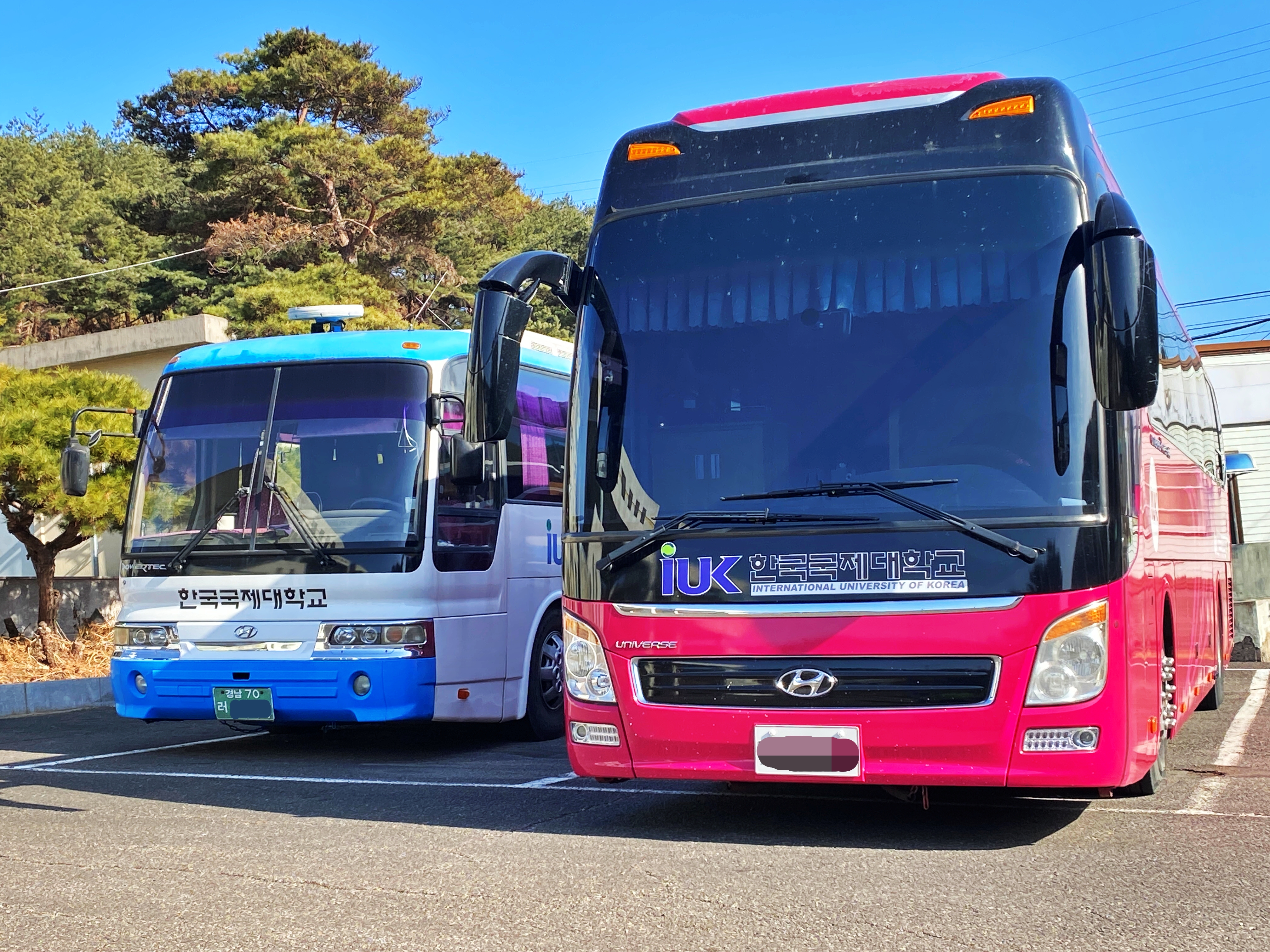 정문 앞으로 버스 두대가 세워져 있습니다.