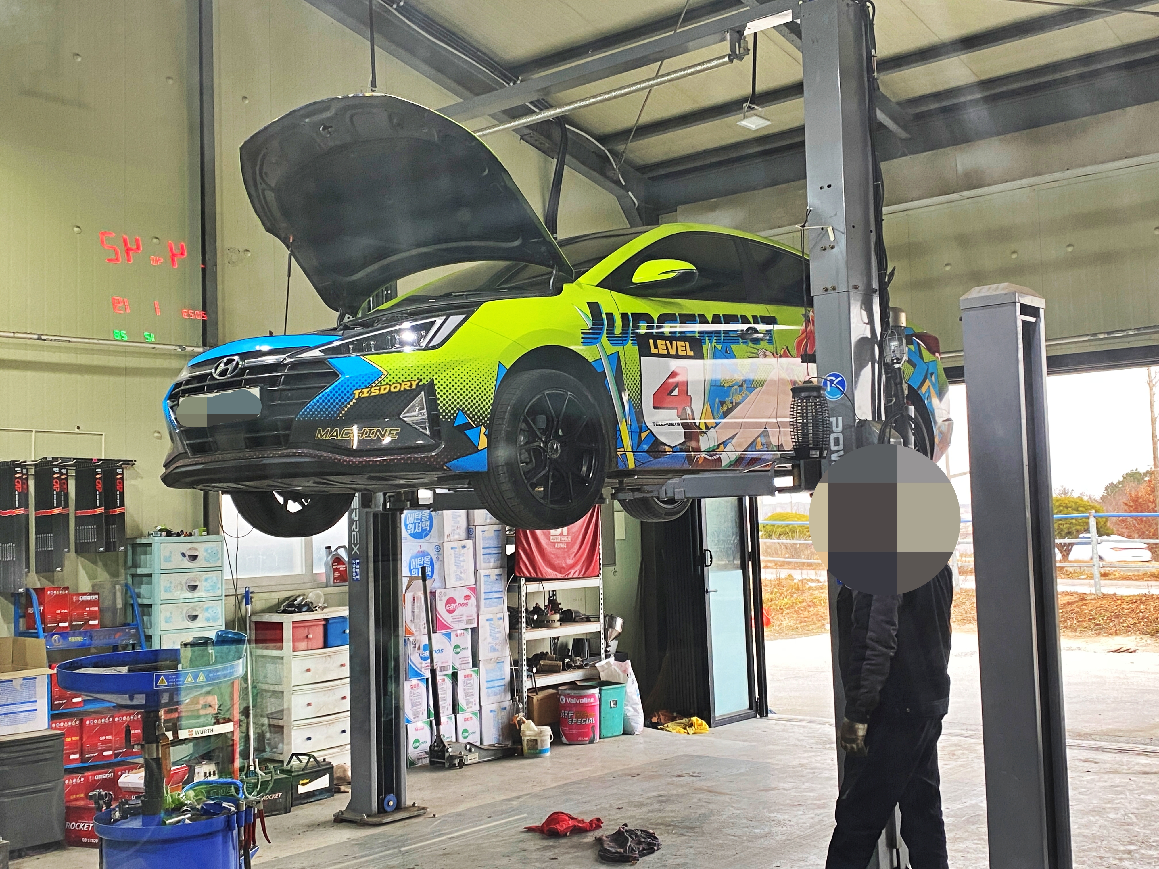 잔유를 배출하며 공기압을 보충합니다. 엔진오일 드레인이 끝난 차량을 내려 필터를 교체하고 신유를 주입해줍니다. 지금껏 큰 문제 없이 탔는데, 이제 슬슬 시작이라니 답답하기만 하네요..