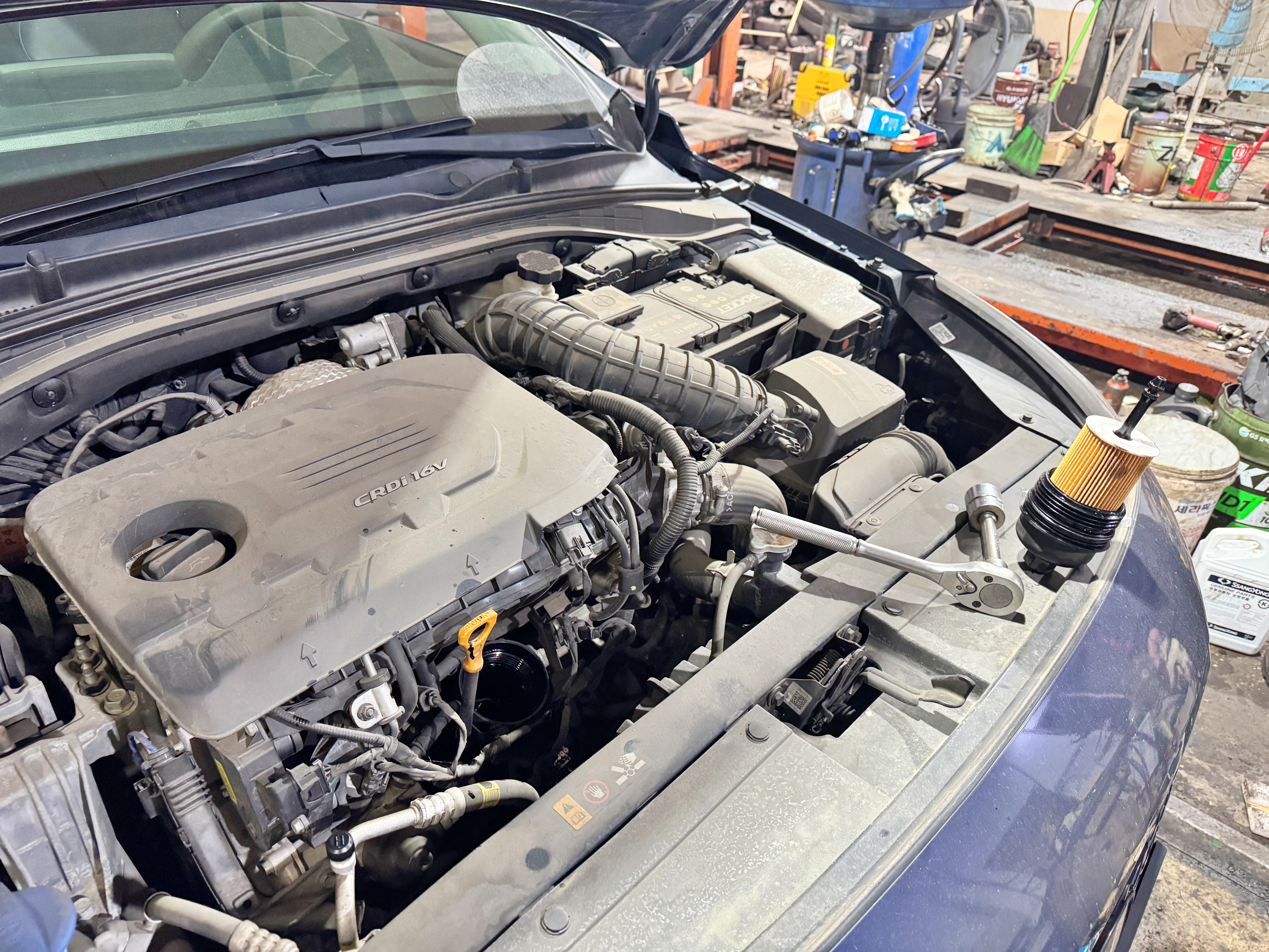 이제 겨우 6만 km를 탄 차량이기에 별다른 누유는 당연히 없습니다. 삼각떼 출고 이후 다만 한 달에 한 번 수준으로 세차장에서 에어건이라도 불어주며 깔끔하게 유지하려 노력했었는데, 그렇지 않은 차의 엔진룸은 이렇습니다. 먼저 오일필터를 교체하는데, 카트리지 형식의 필터를 꺼내니 슬러지로 떡져있었고 필터에 표시된 품번조차 보이지 않았습니다.