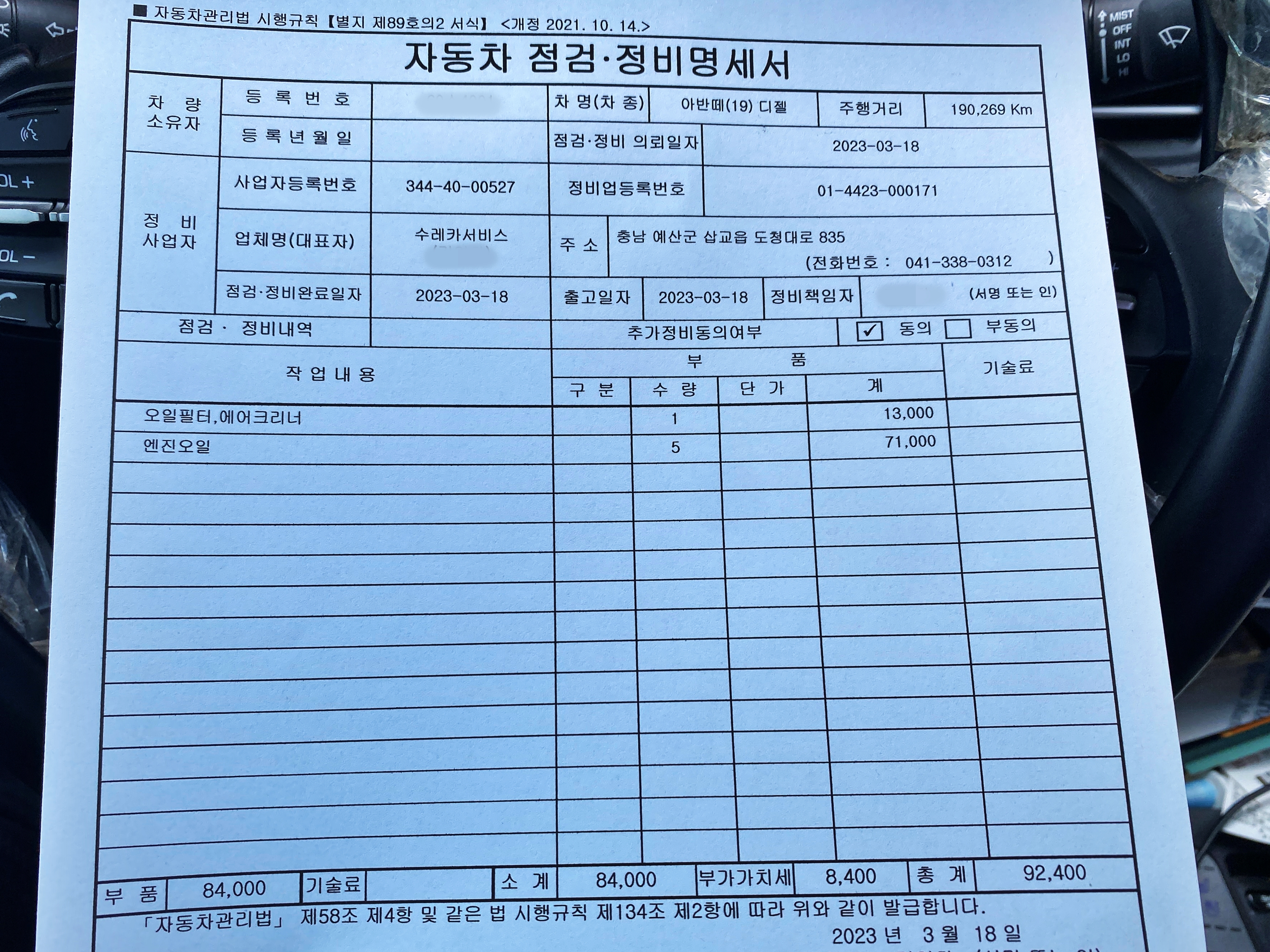 62,404km에 엔진오일을 교체했습니다.