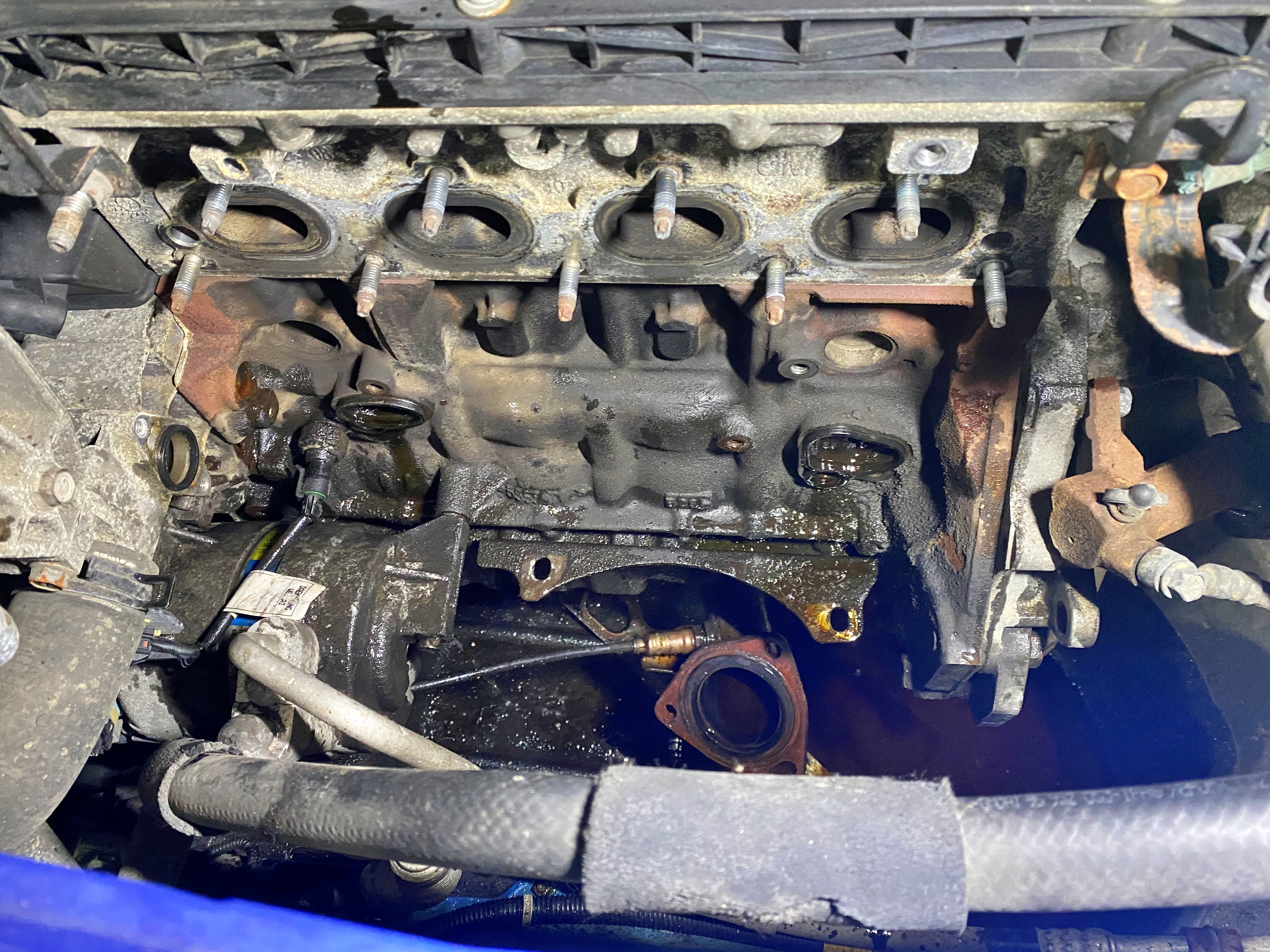 다른 씰들은 다 블럭에 붙어버렸고 가장 핵심이 되는 엔진오일과 냉각수를 밀봉해주는 씰만 붙어서 나왔네요. 자세히 보면 씰 주위로 새어나온 흔적들이 보입니다. 섞이지는 않았지만 이왕 내리는 김에 작업해주는게 시간적으로도 정신적으로도 이로울겁니다. 깨끗하게는 닦지 못해도 기존의 씰을 제거한 뒤 쩔어붙은 기름때는 어느정도 잘 닦아주고 올렸습니다.