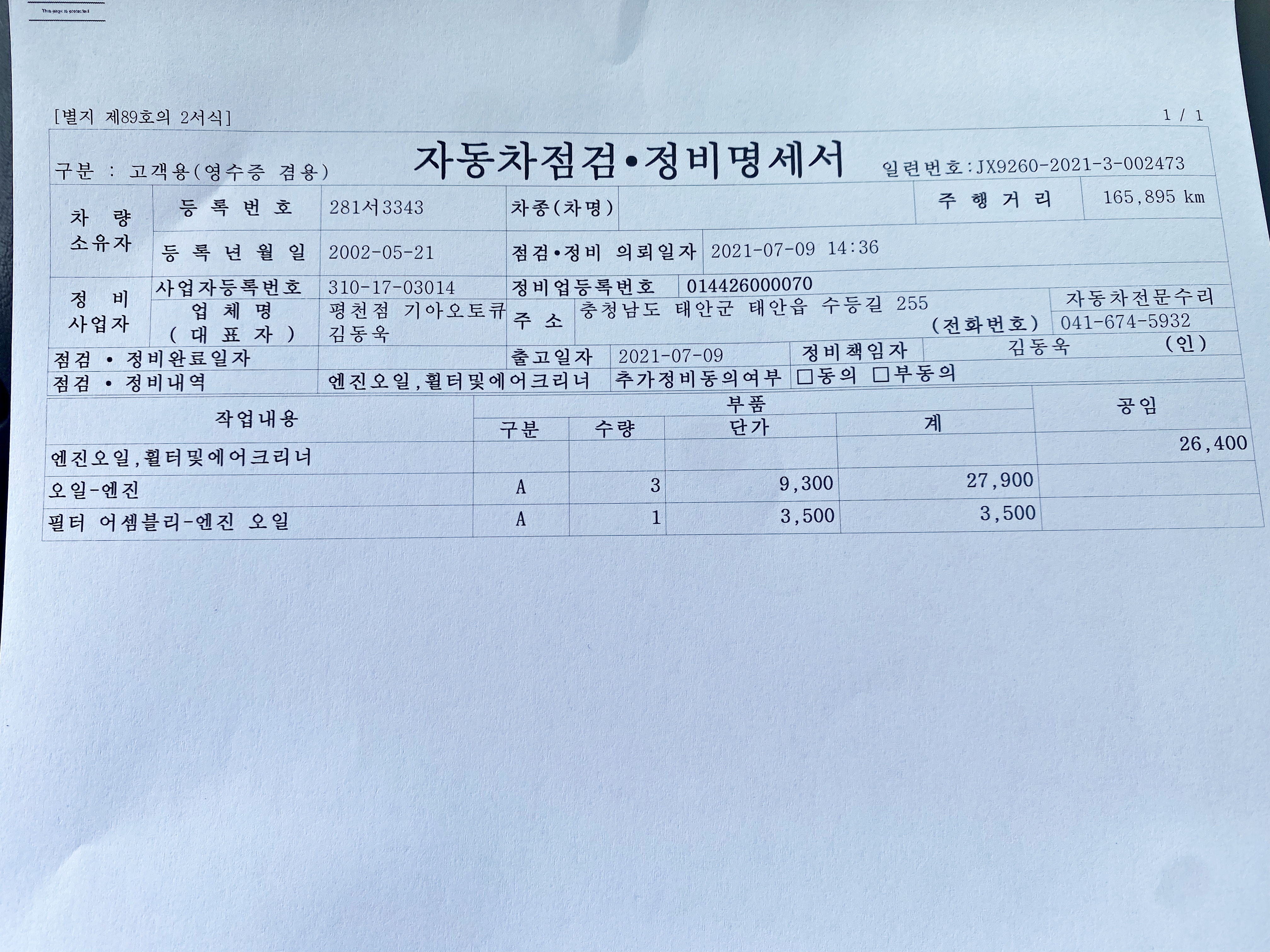 정비명세서를 받고 공임과 오일필터 값을 지불합니다.