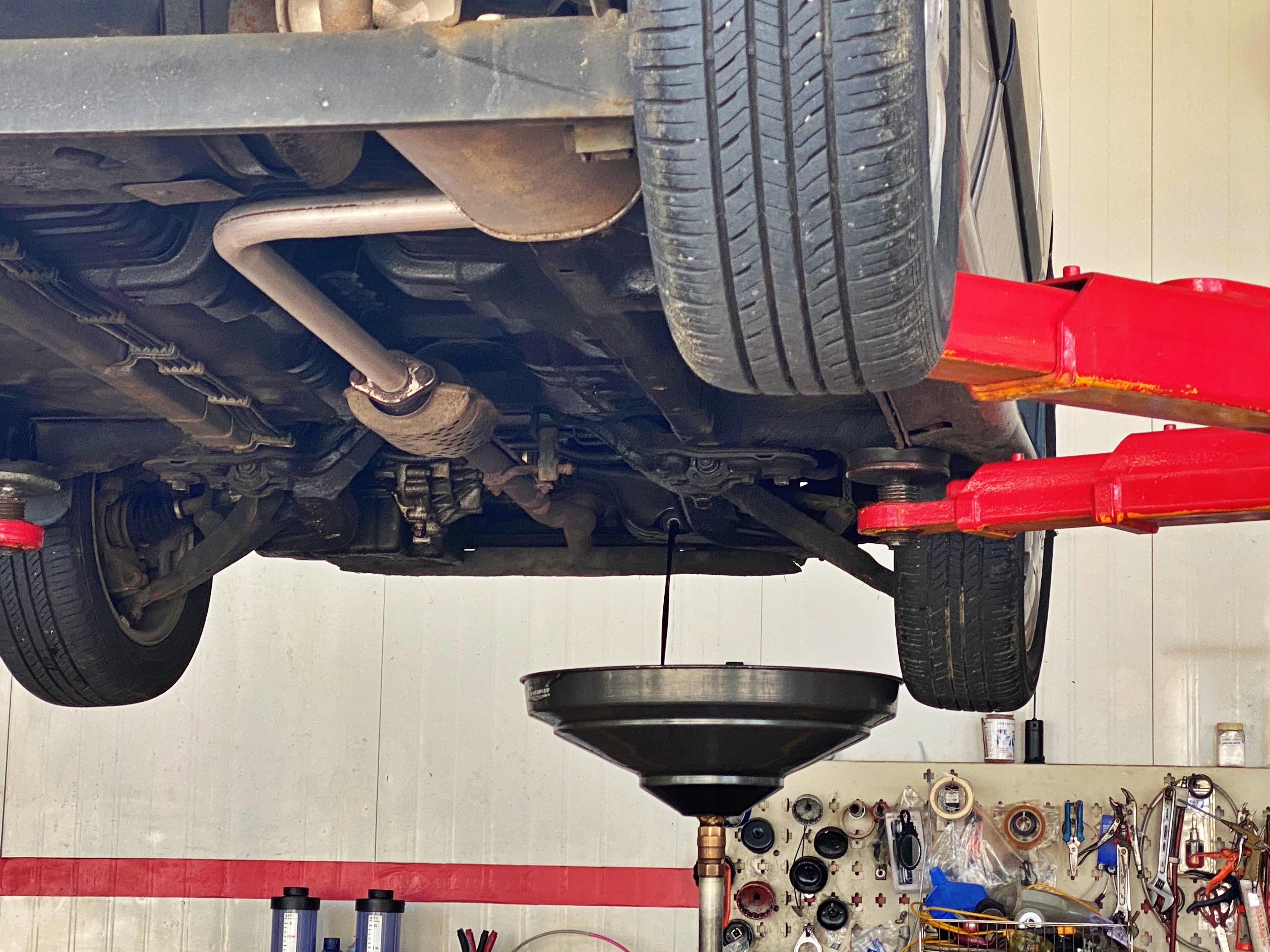 기존 엔진오일을 모두 배출해낸 뒤 드레인 코크를 막고 공기압을 보충한 뒤 차를 내립니다.