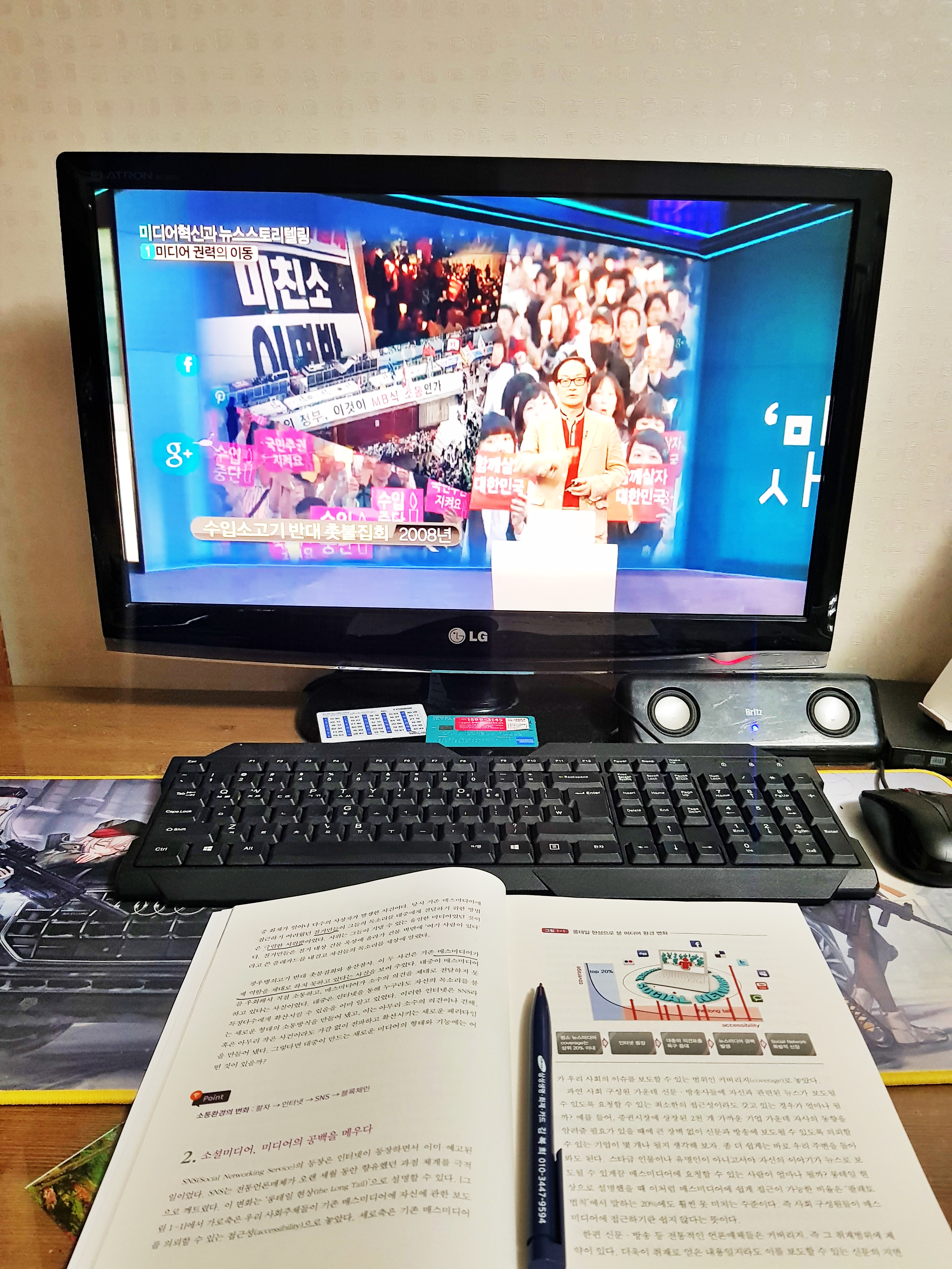 소셜미디어에 대해 설명하며 2008년 광우병 촛불집회 얘기가 나오네요. 당시 대중들은 기성언론 대신 직접 개인방송으로 현장을 중계하거나 다음 아고라에 모여 여론을 형성했습니다. 저도 당시 아고라에서 활동했던지라 그 시절 기억이 생생합니다.