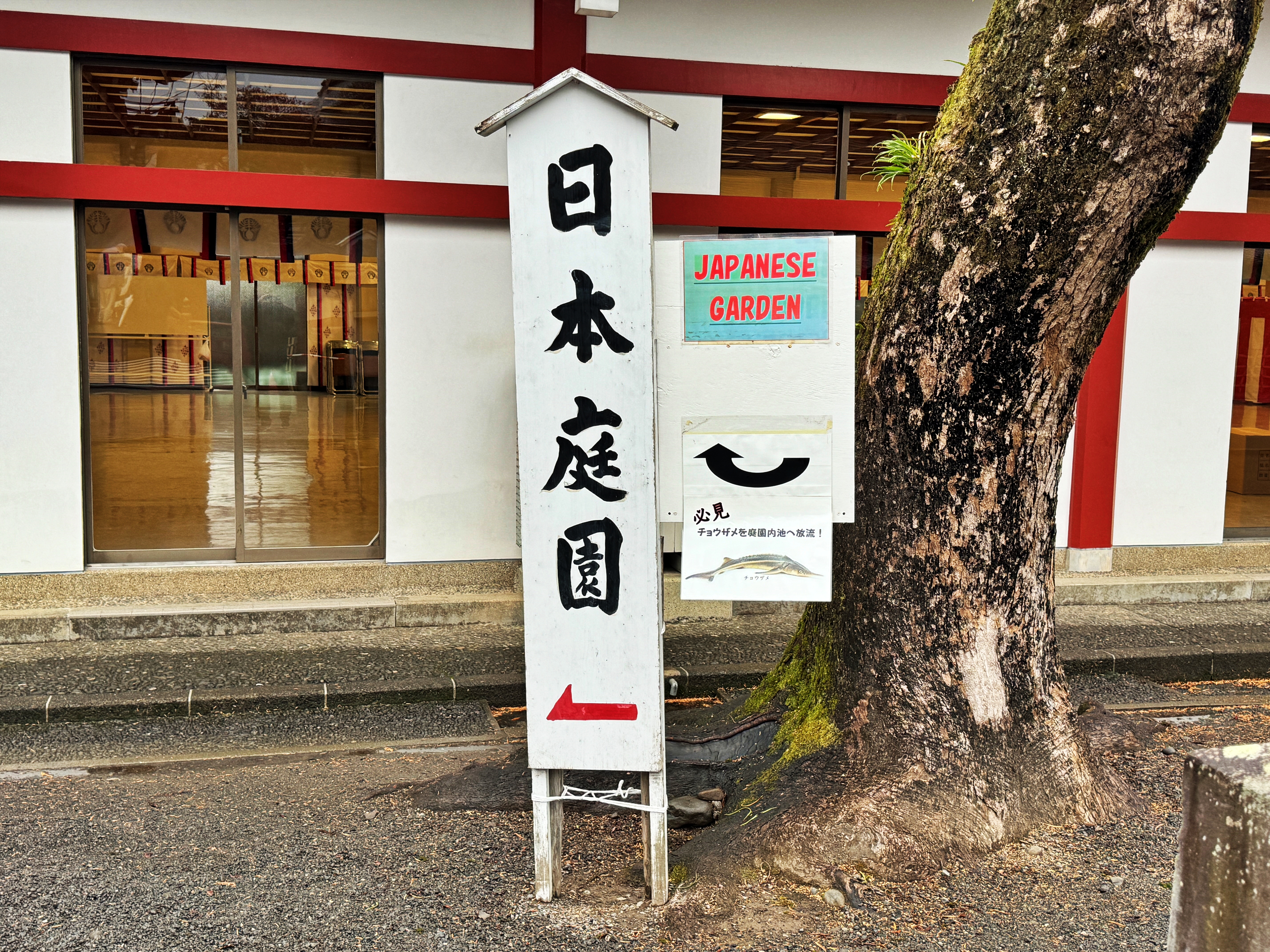 신사 본전보다도 눈이 가는게 있었습니다. 철갑상어가 있는 정원이라네요.