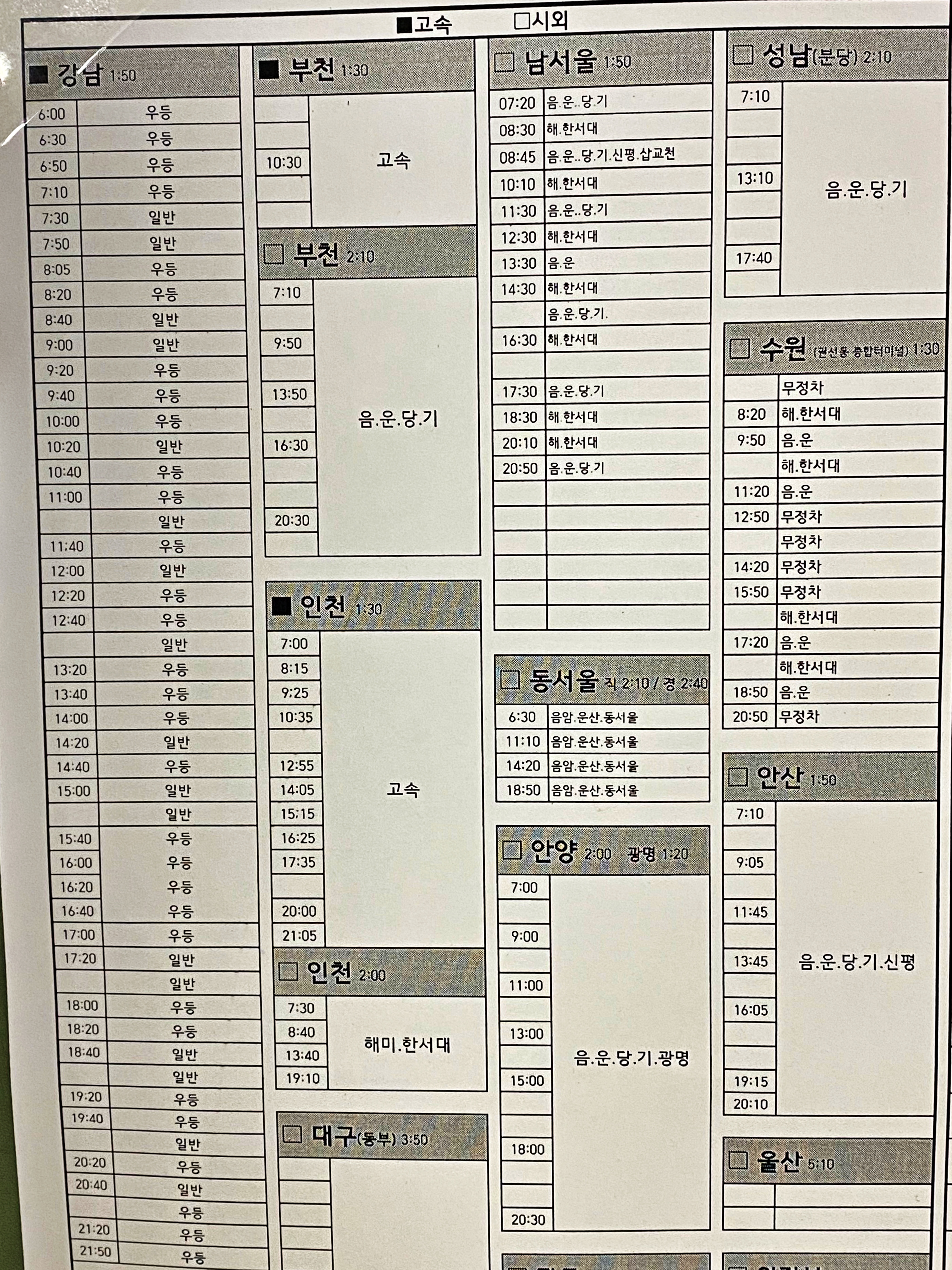 2020년 11월 기준 서산터미널 시외버스 및 고속버스 시간표입니다.