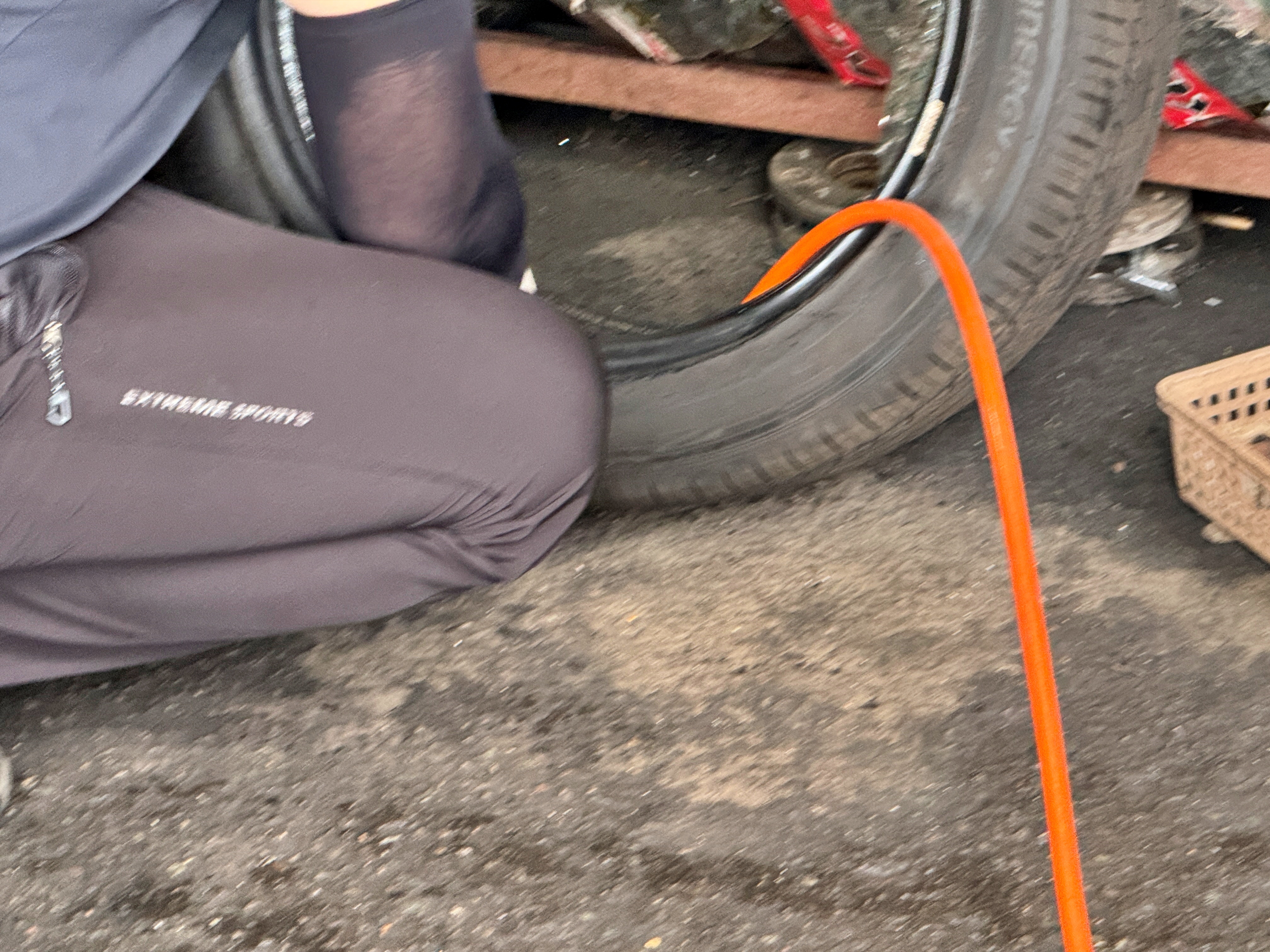 뒤로도 계속 기다리는 손님들이 생기고 빗방울도 떨어지지만 작업에 지연이란 없습니다. 새 타이어의 장착 작업이 진행되던 와중 타이어 한 짝에 펑크가 있었습니다. 바로 펑크까지 때워서 장착해 주십니다.