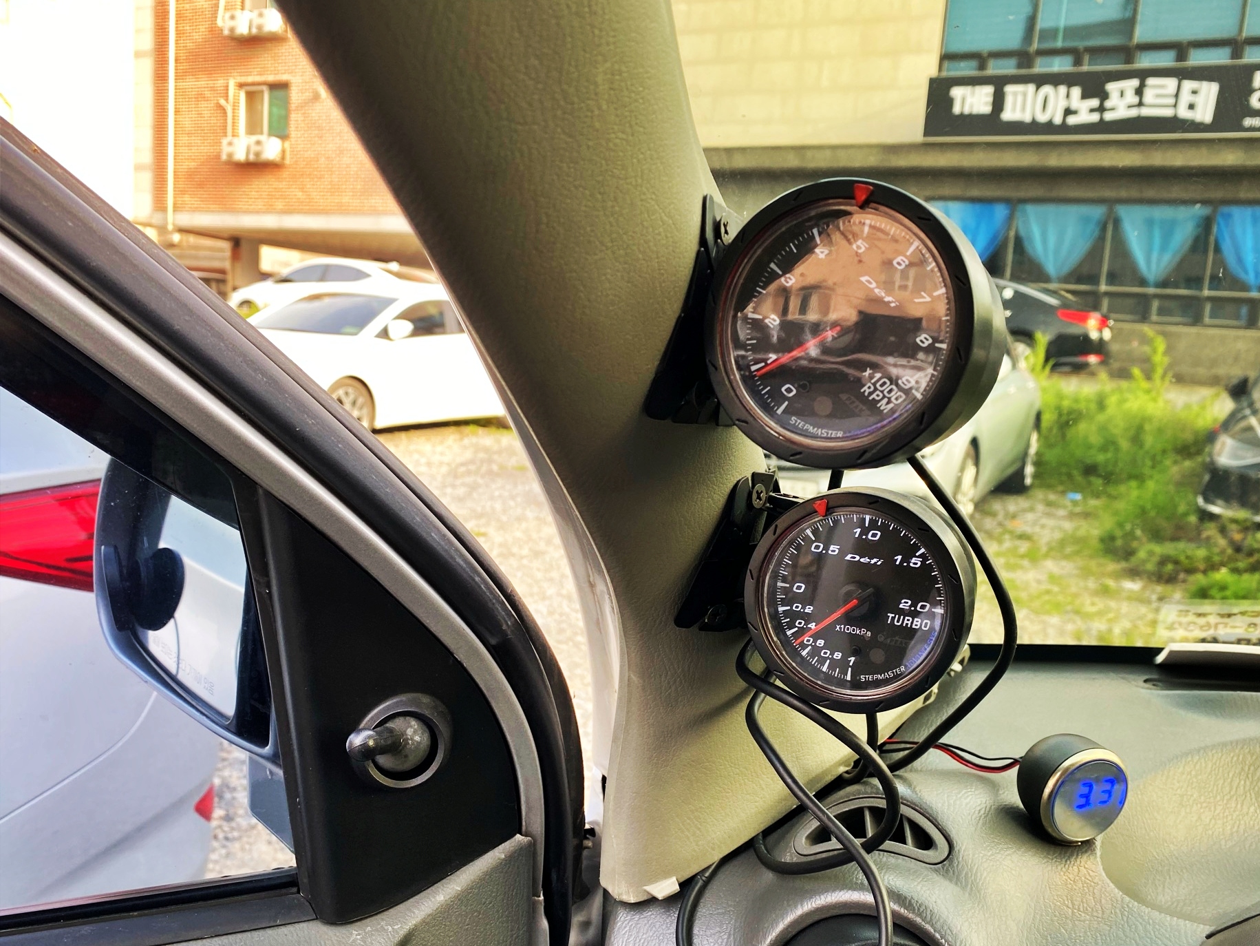 앞에 보이는 작은 게이지는 미션오일쿨러를 장착하면 달아주는 게이지입니다. 미션오일 온도와 전압을 표시해주는데 배선이 매우 얇아서 이 배선은 그냥 내비둬도 무방합니다. 이렇게 숨기면 홀쏘를 구해다가 필러트림에 구멍을 뚫을 필요가 없습니다. 그래도 튀어나오는 배선은 주차번호판으로 가려주면 됩니다.