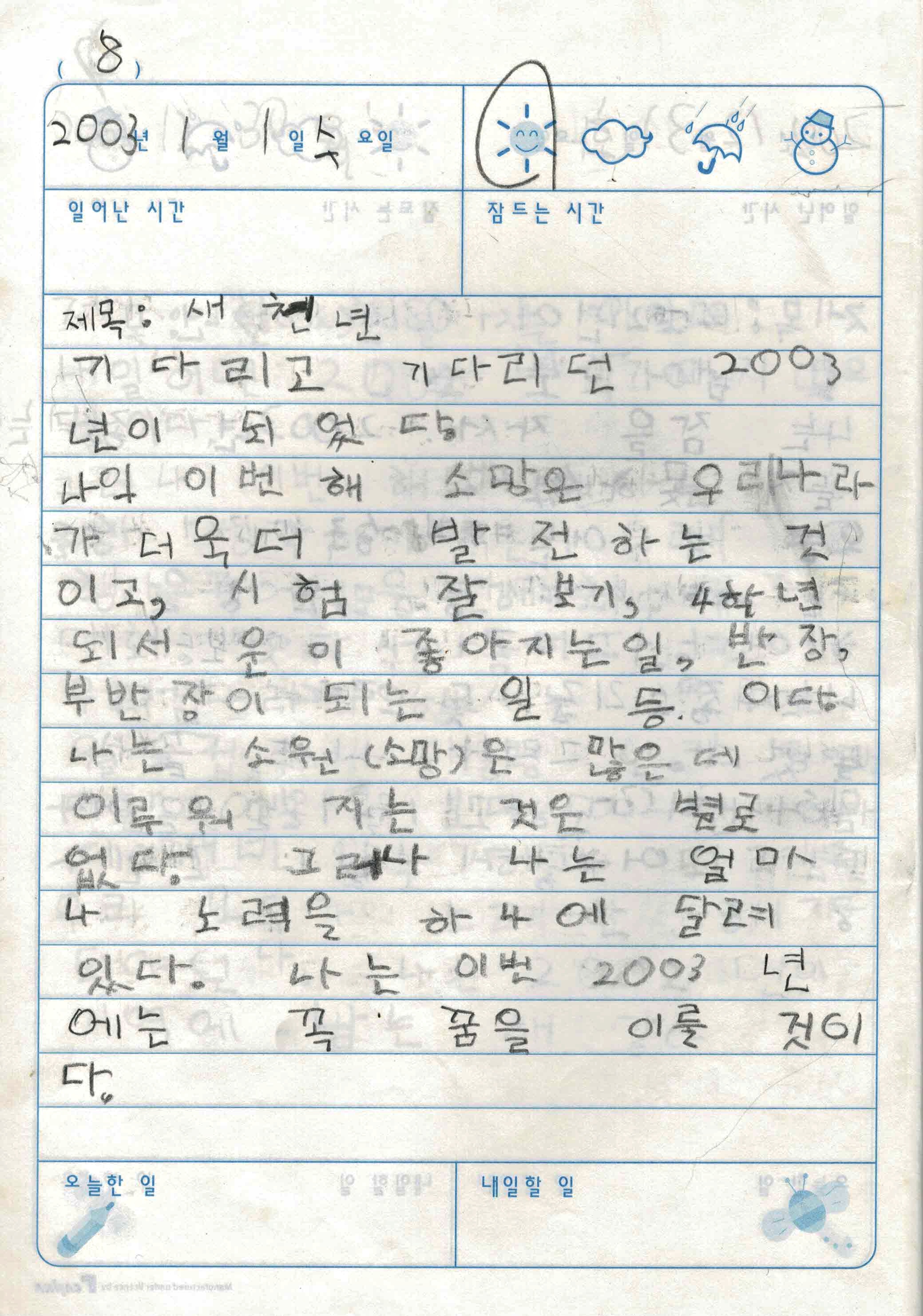 2003년 1월 1일에 작성한 일기인데 새천년이 열린지 한참 지난 2003년 1월에 새천년이라는 제목으로 일기를 썼는지는 모르겠습니다. 뭐 그냥 평범한 소망이 담긴 새해 첫날 일기인데, 오늘은 2020년의 끝자락에서 2003년 1월 1일에 소망했던 초등학생의 일기를 펼쳐보기로 합시다.