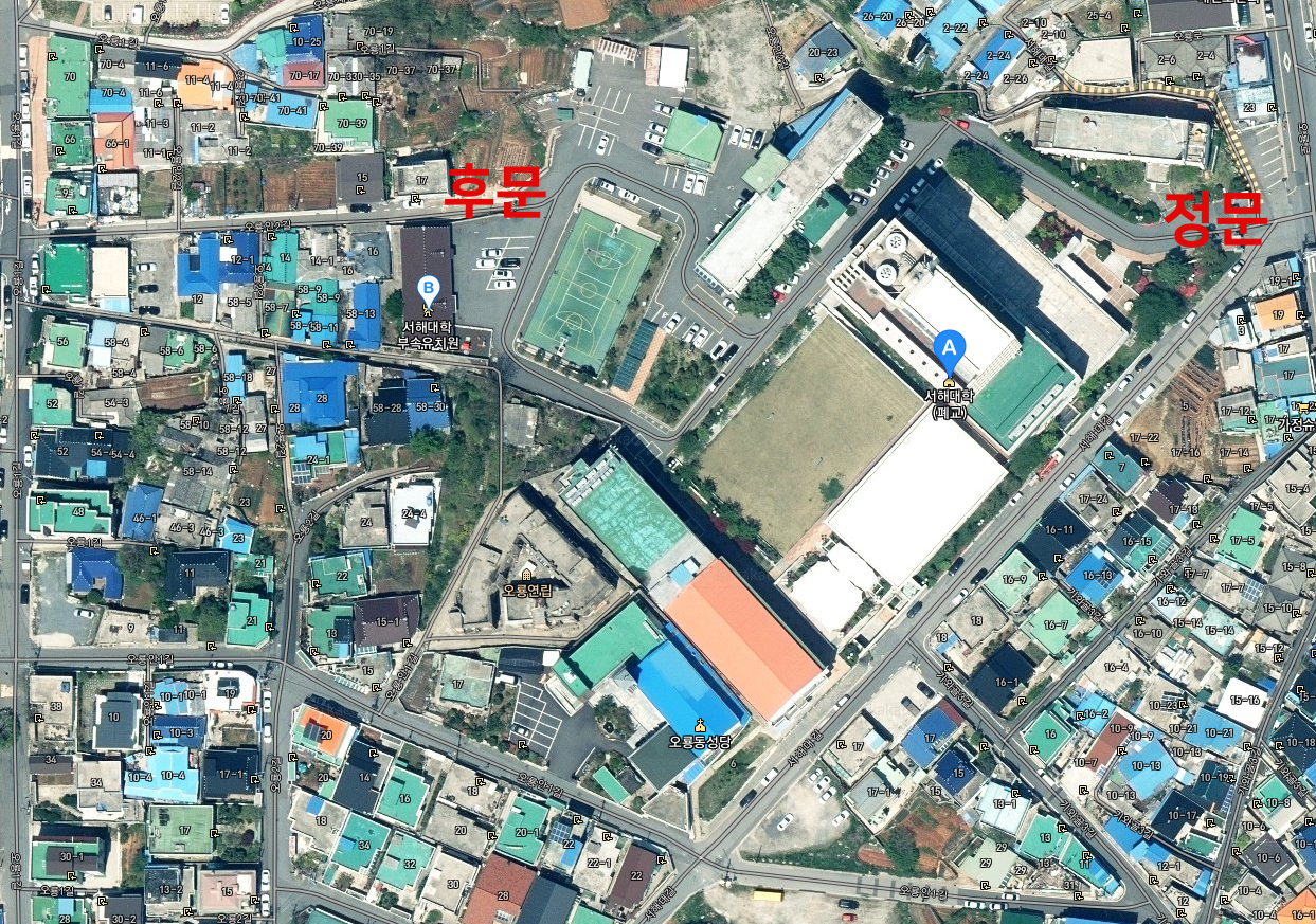 정문과 바로바로 대치대는 부분에 후문이 존재합니다. 서해대학 부속유치원이 후문 바로 옆에 위치하고 있고요. 사실 말이 후문이지 골목길 앞까지는 차량 출입이 가능하고 후문은 사람 하나 겨우 드나드는 수준의 문입니다.