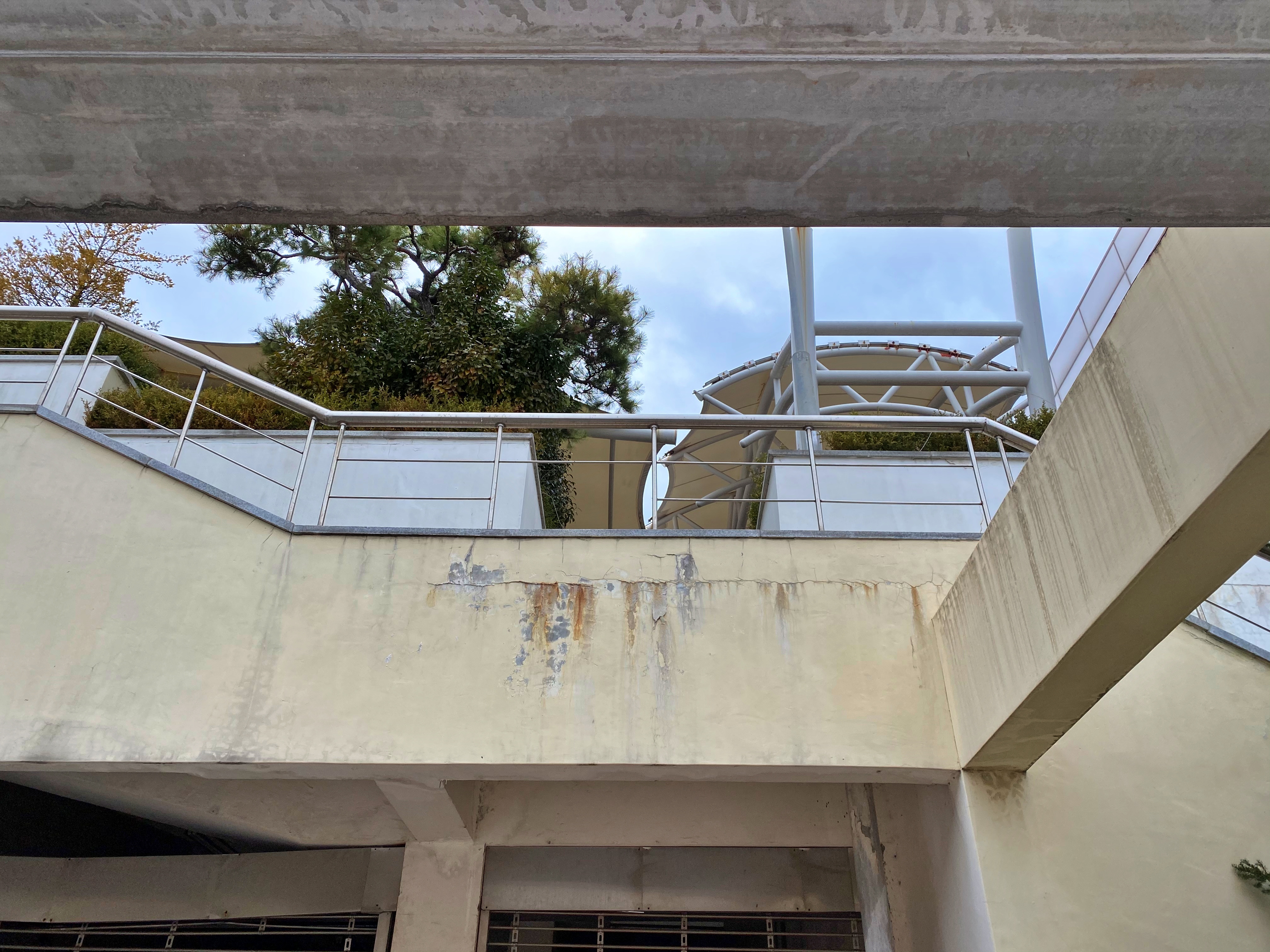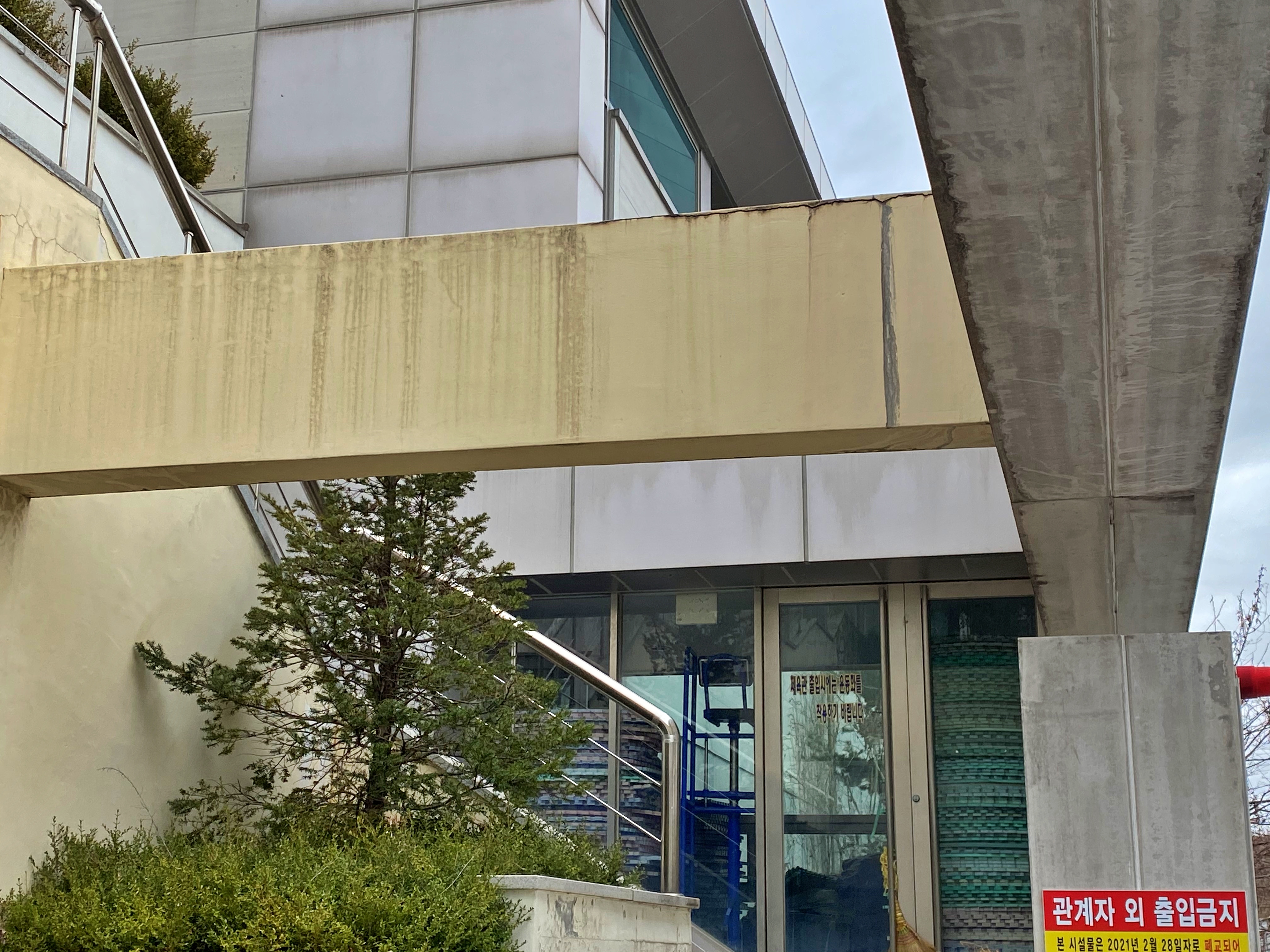 신설관 방향으로 캠퍼스로 올라가는 계단으로 보이네요. 지하주차장을 지나 신설관 아래부터 이 계단이 있는 공간까지 80년대 스타일의 높은 옹벽이 쳐진 상태였습니다. 그리고 내내 학교 건물들과 비슷하게 생긴 건물 옆으로 계단을 내놨는데 여기까지도 출입금지 경고문을 붙여놨습니다.