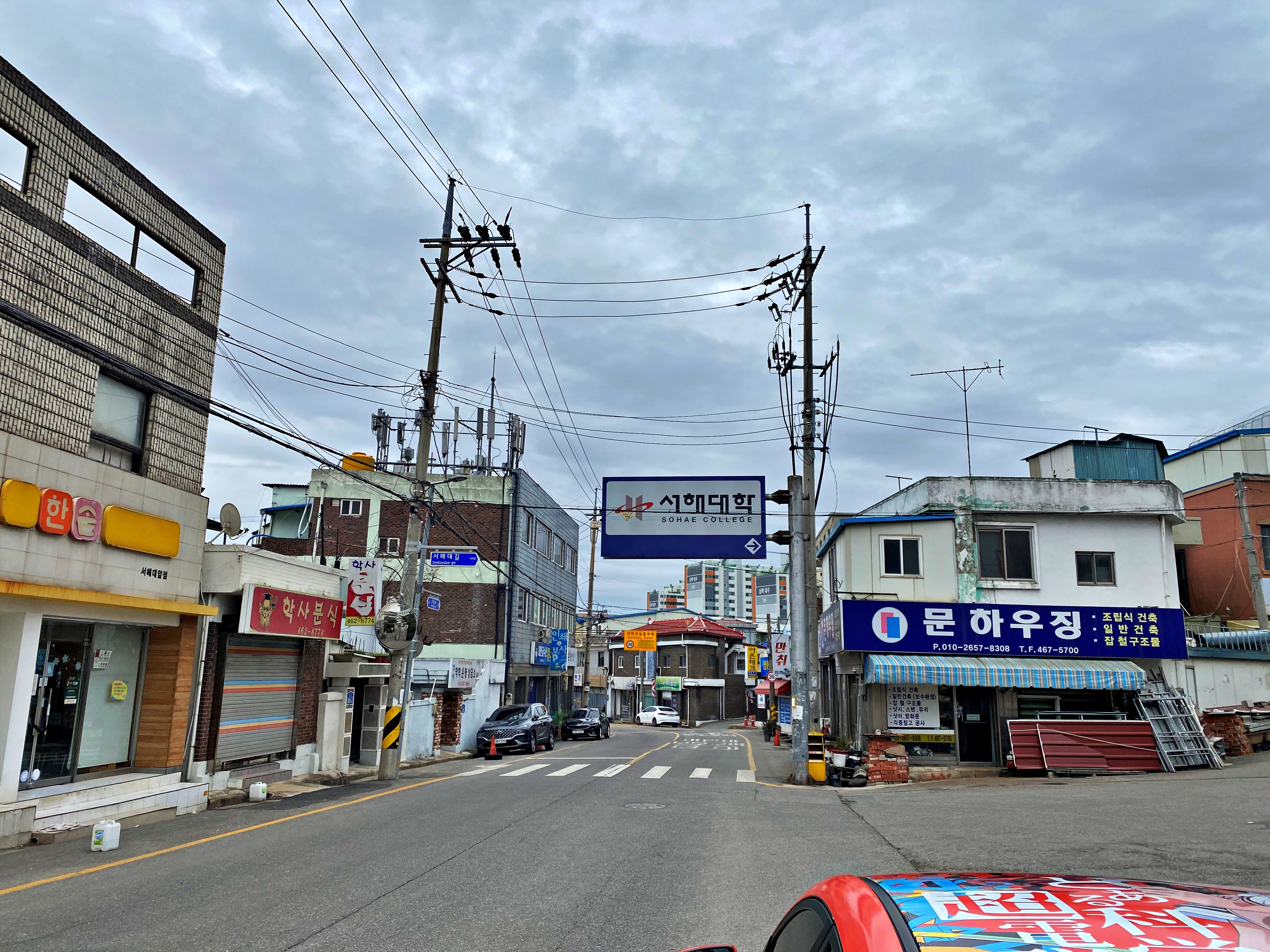 네. 왕복 2차선 도로를 타고 오래된 건물 사이를 달리다 보니 서해대학 이정표가 보입니다.